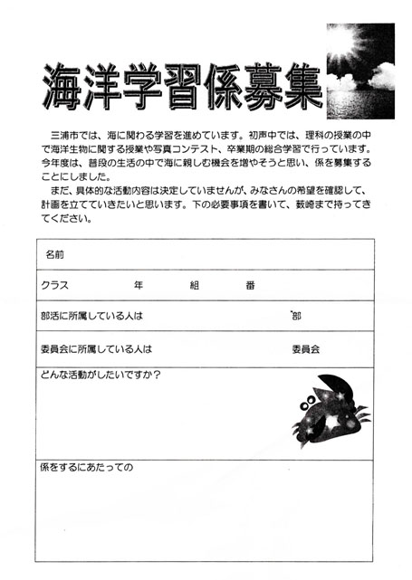 市内中学校で海の生き物の世話などを行う「海洋学習係」の募集チラシ。海洋教育推進の成果である。