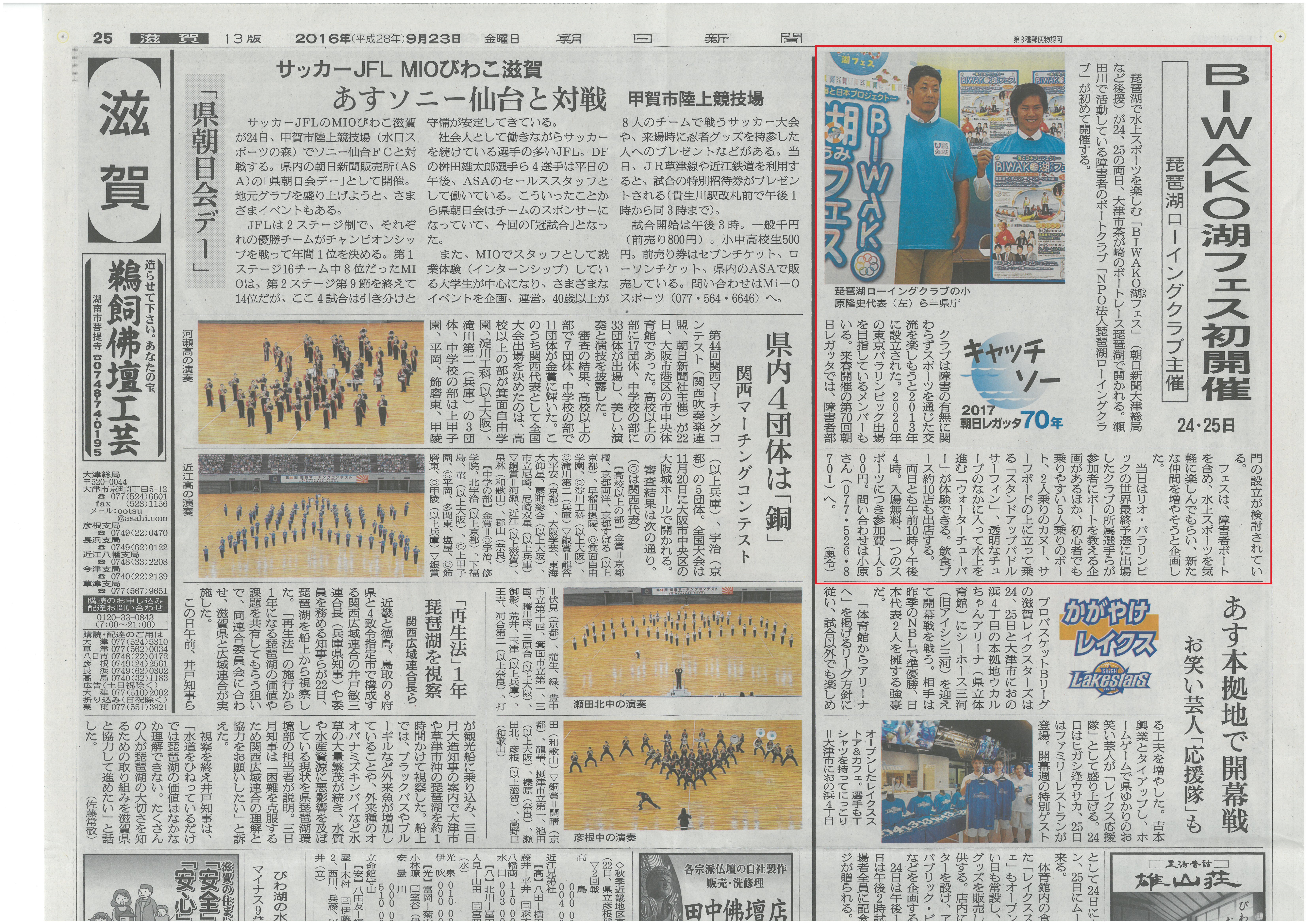【KBSラジオの音源】 ②2016年度「森脇健児サタスタinBIWAKO湖フェス」告知CM ③2016年度「KBS海平アナ」告知CM(動画ではなく音声) 【新聞記事】 ④2016年度「記者会見@滋賀県庁」朝日新聞記事 【イベントポスターとチラシ】 ⑤2016年度「ポスター」(作成部数 1,200枚)、「チラシ」(作成部数 98,000部) 【イベントホームページ】 ⑥2016「BIWAKO湖フェス」ホームページ 【イベント看板】 ⑦サイン一式 ⑧のぼり 【報告書】 ⑨POWER FILE★1143(KBS京都ラジオ編成Vol.709) |