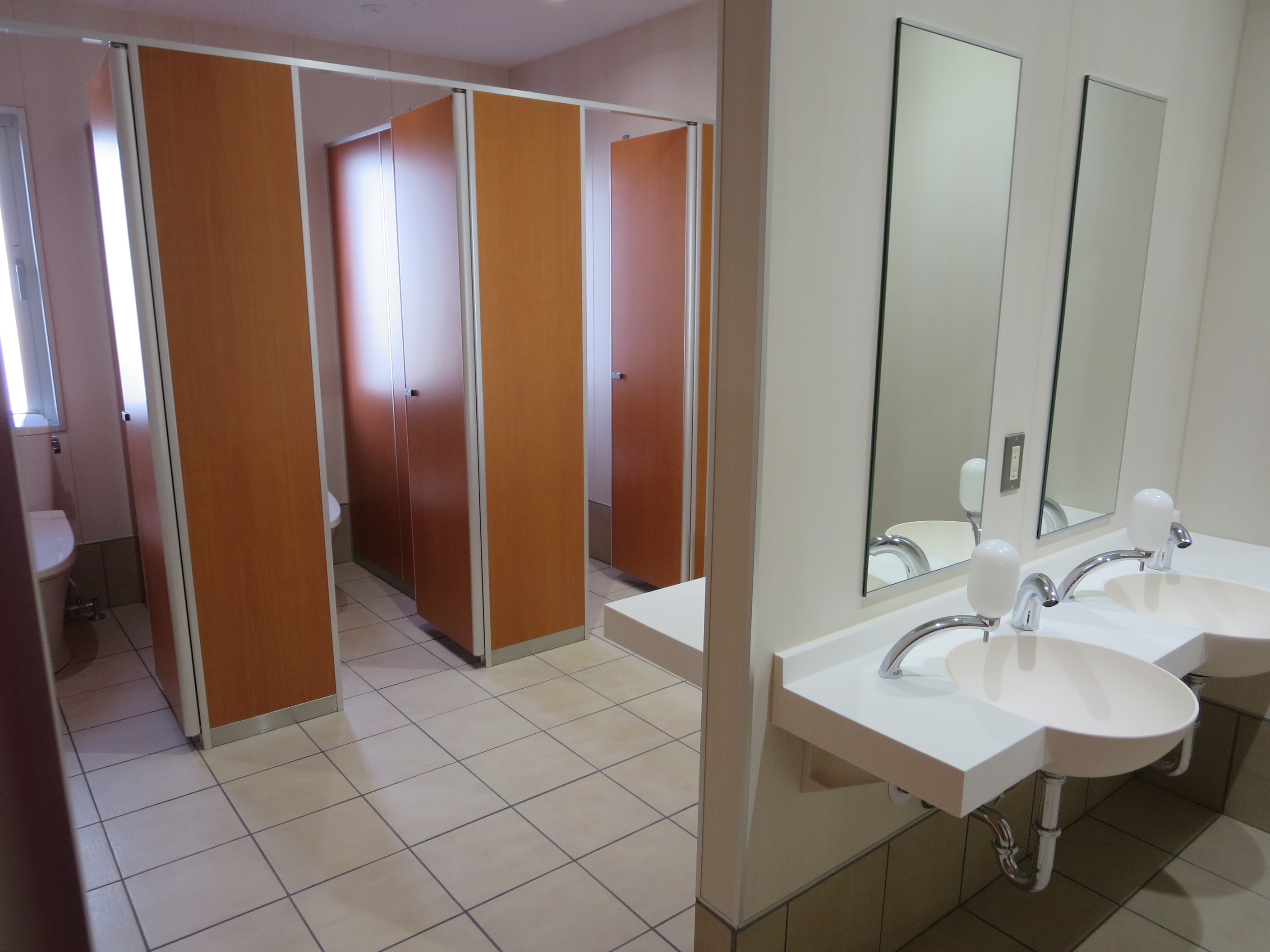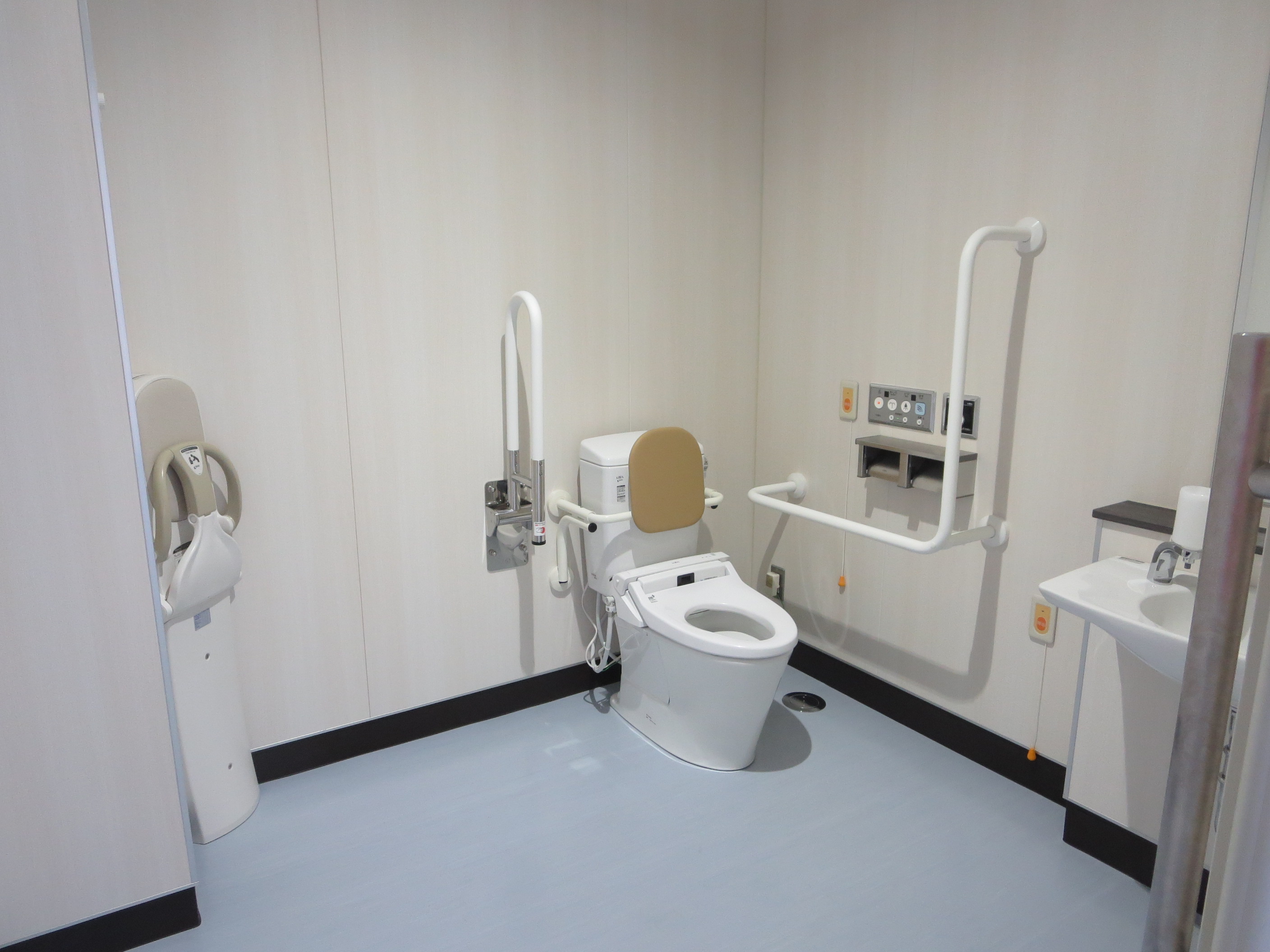 外観、玄関、エレベーター棟、女子トイレ、多目的トイレ |