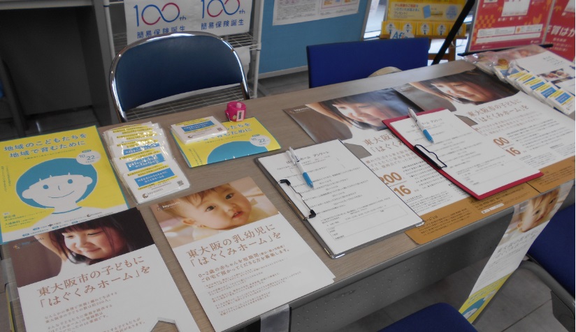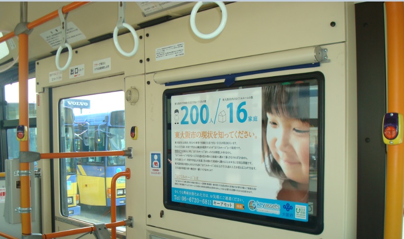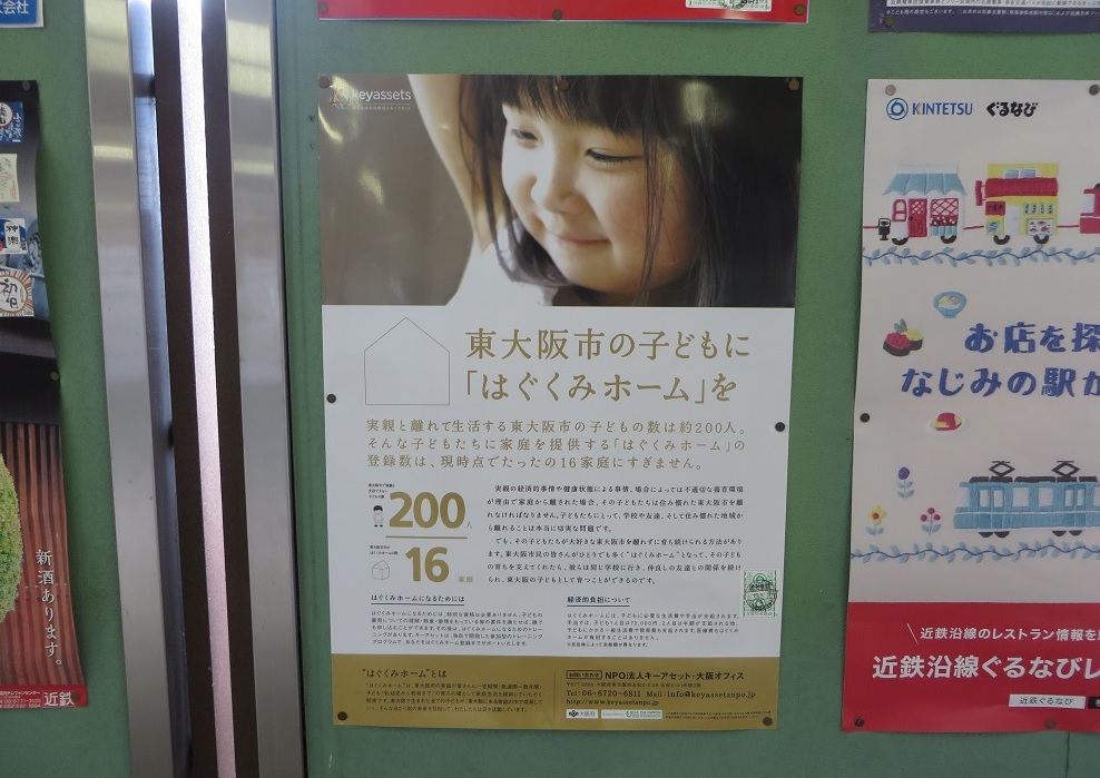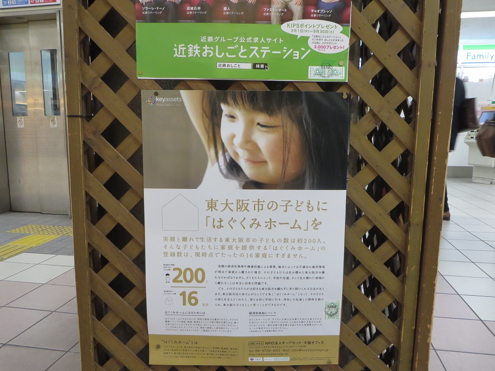 東大阪市にお住まいの方に向けて、広く養育里親を周知するため、公共交通機関や郵便局内にて広報活動を行いました。
