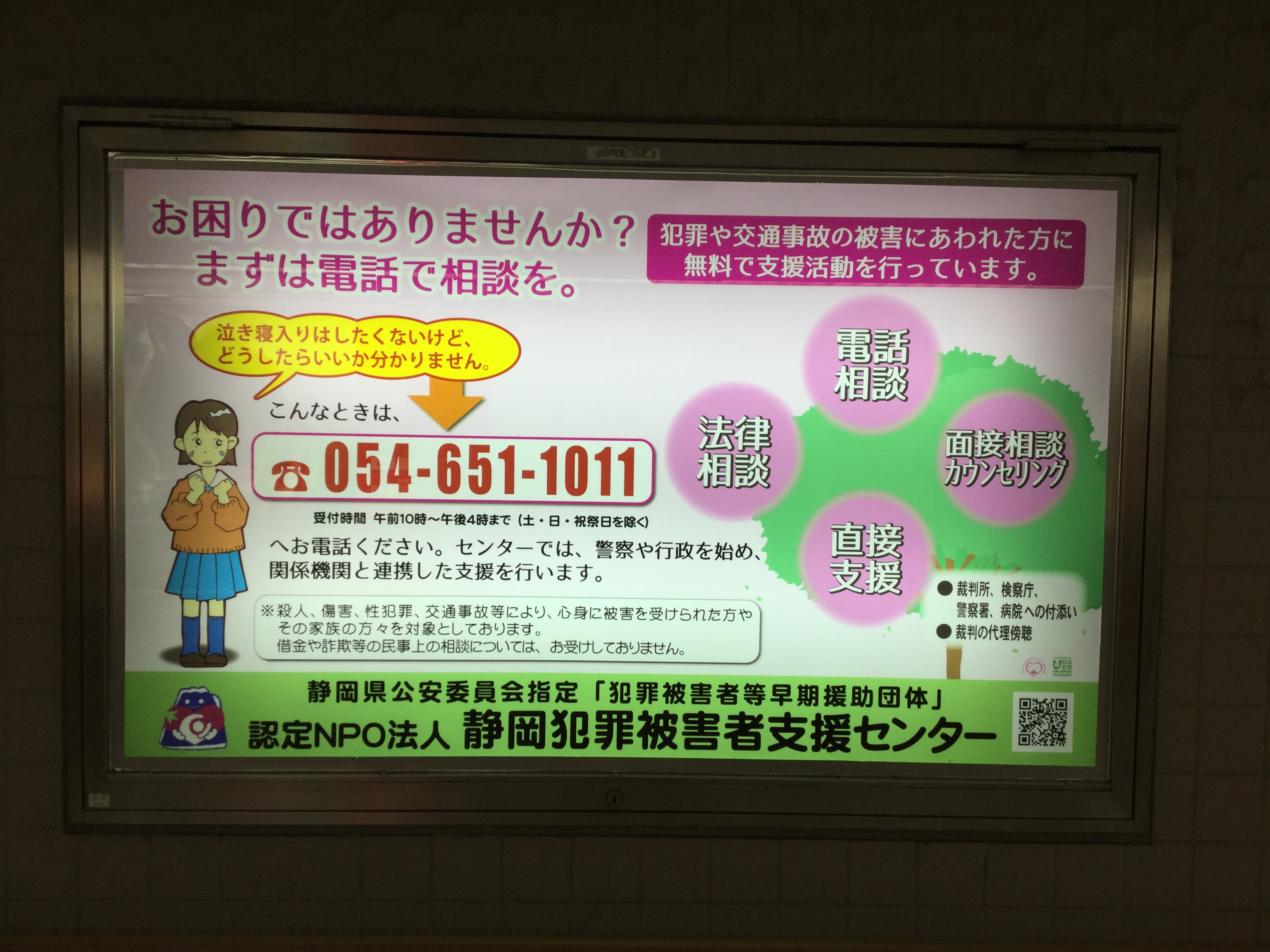 人材育成では、犯罪被害相談員の資格を有する職員を雇用し、電話相談や直接支援活動に従事した。 更に、広報啓発事業では、電車・バスへの車内広告及び車内放送を引き続き実施したほか、静岡県タクシー協会と静岡県個人タクシー協会の協力をいただき、県内のタクシー5,000台に広告ステッカーを貼付していただいた。また、人の往来が多い静岡駅地下道と浜松駅地下柱に大型広告を掲出し、積極的な広報啓発活動を実施した。 |