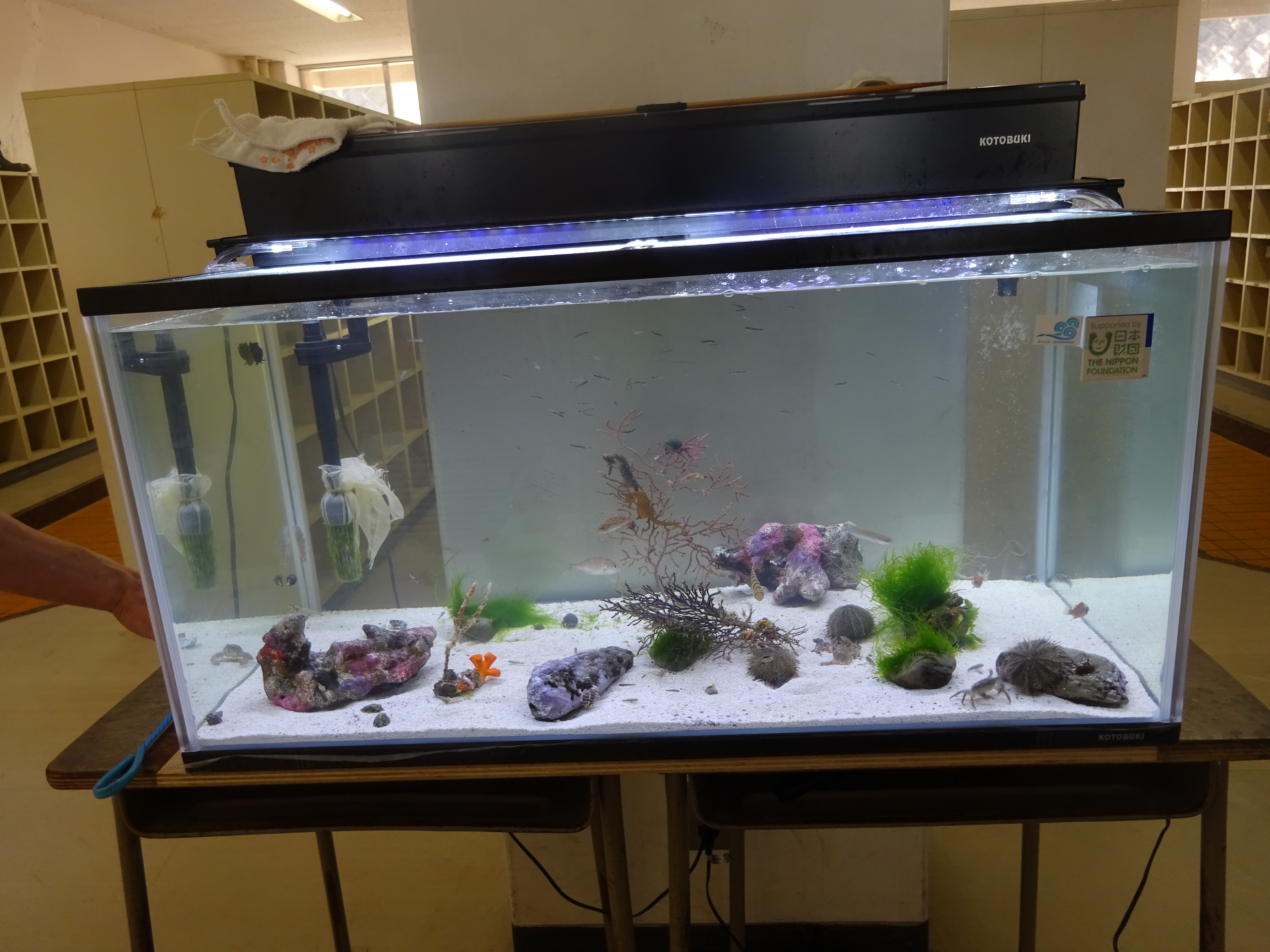 三浦市内の小学校「旭小」校内に設置された水槽の写真。