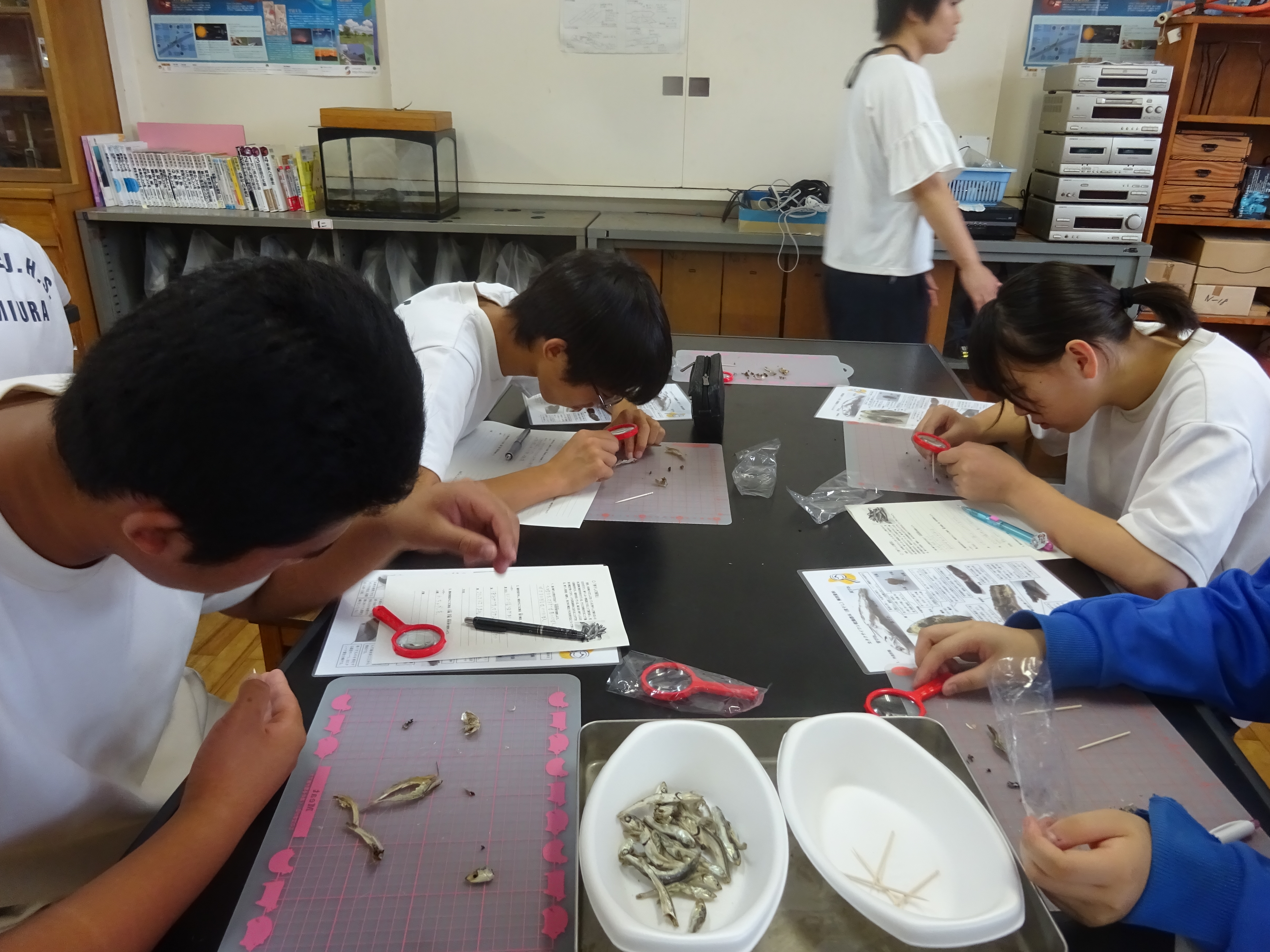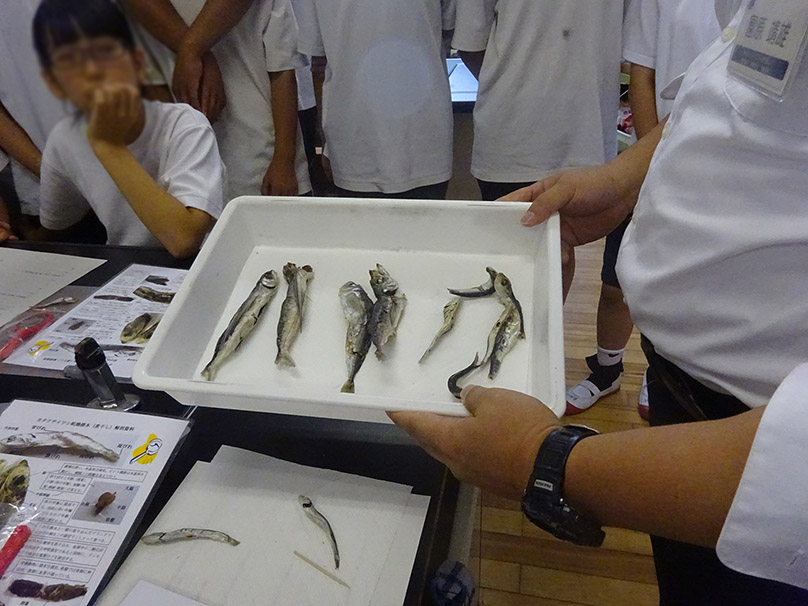 三浦市内中学校「初声中」での煮干しの解剖のようす。