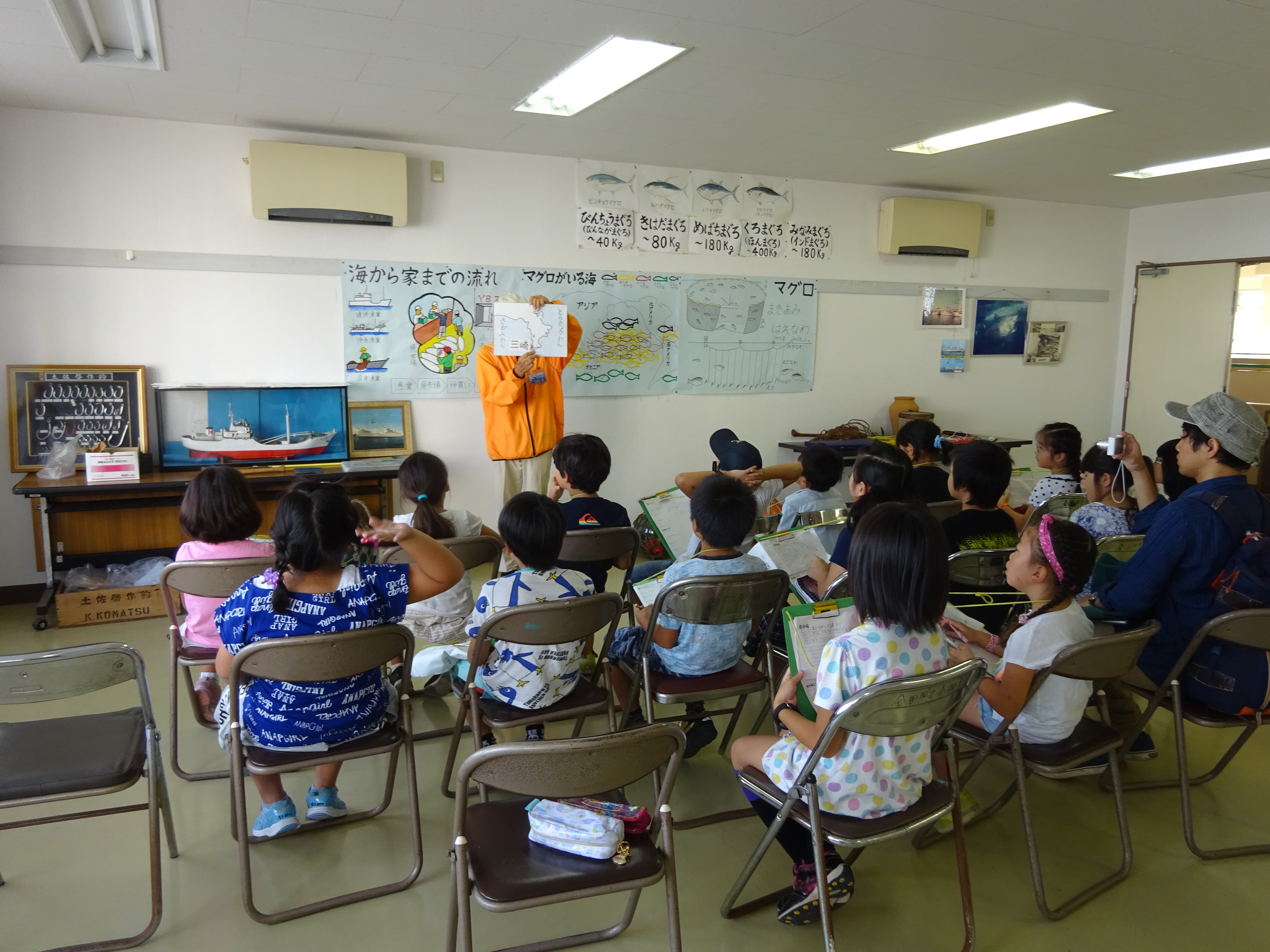 三浦市内小学校「岬陽小学校」で行われた、魚市場見学のようす。