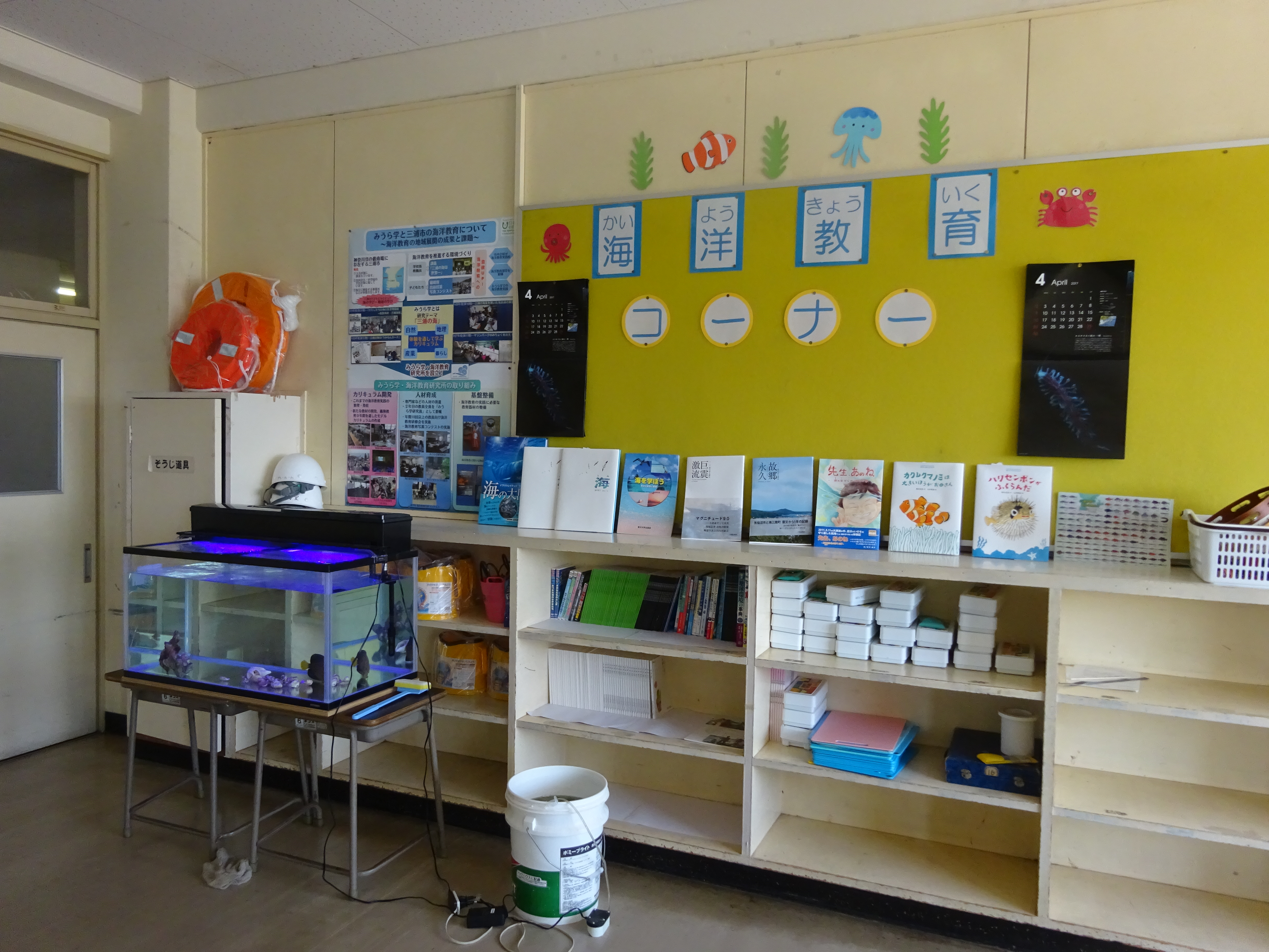 三浦市内小学校「旭小学校」に設置された海洋教育コーナーのようす。