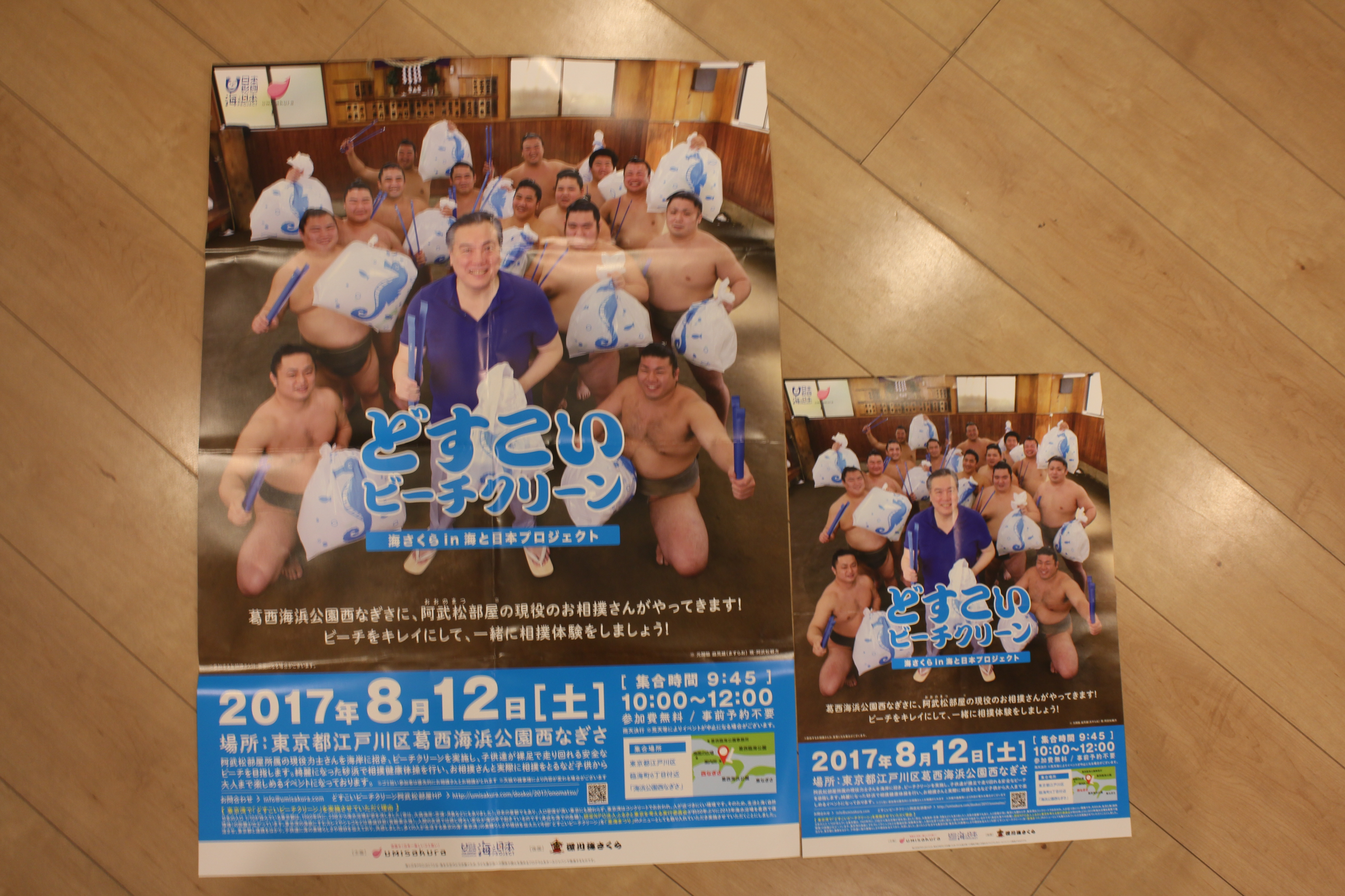 阿武松部屋の現役力士、親方と一緒に東京湾(葛西臨海公園)にてゴミ拾いを実施し、きれいになったビーチで力士による相撲体操・相撲体験を行った。