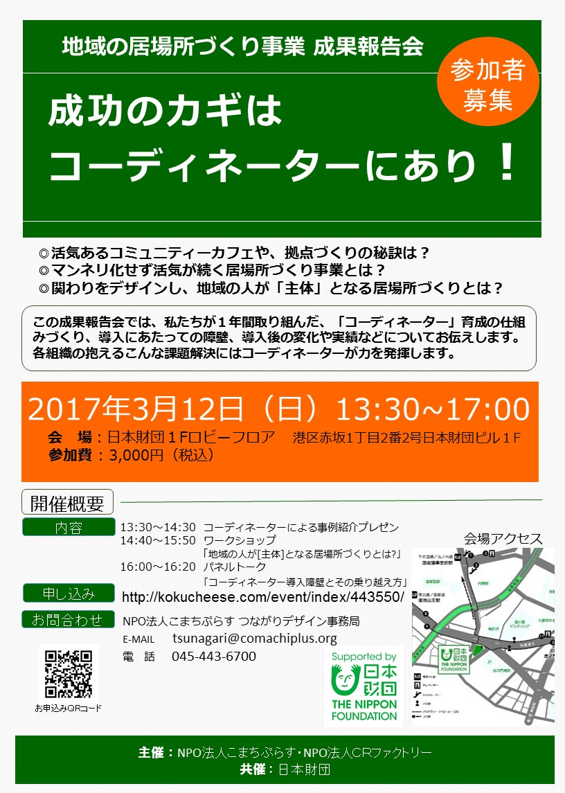 カフェという場だからこそ、等身大の場の設計ができる。 居心地の良い居場所だからこそできるコーディネーションもある。 そんな確信に至るまでの悩みや葛藤、どのように事業として持続できるよう収益源を確保しながら実施できるかを、2017年3月に「地域の居場所づくり事業成果報告会」にて発表した。 報告書では、成果報告会のチラシ及び当日に使用したスライドを元に、事業の概要及び実績を報告している。 |