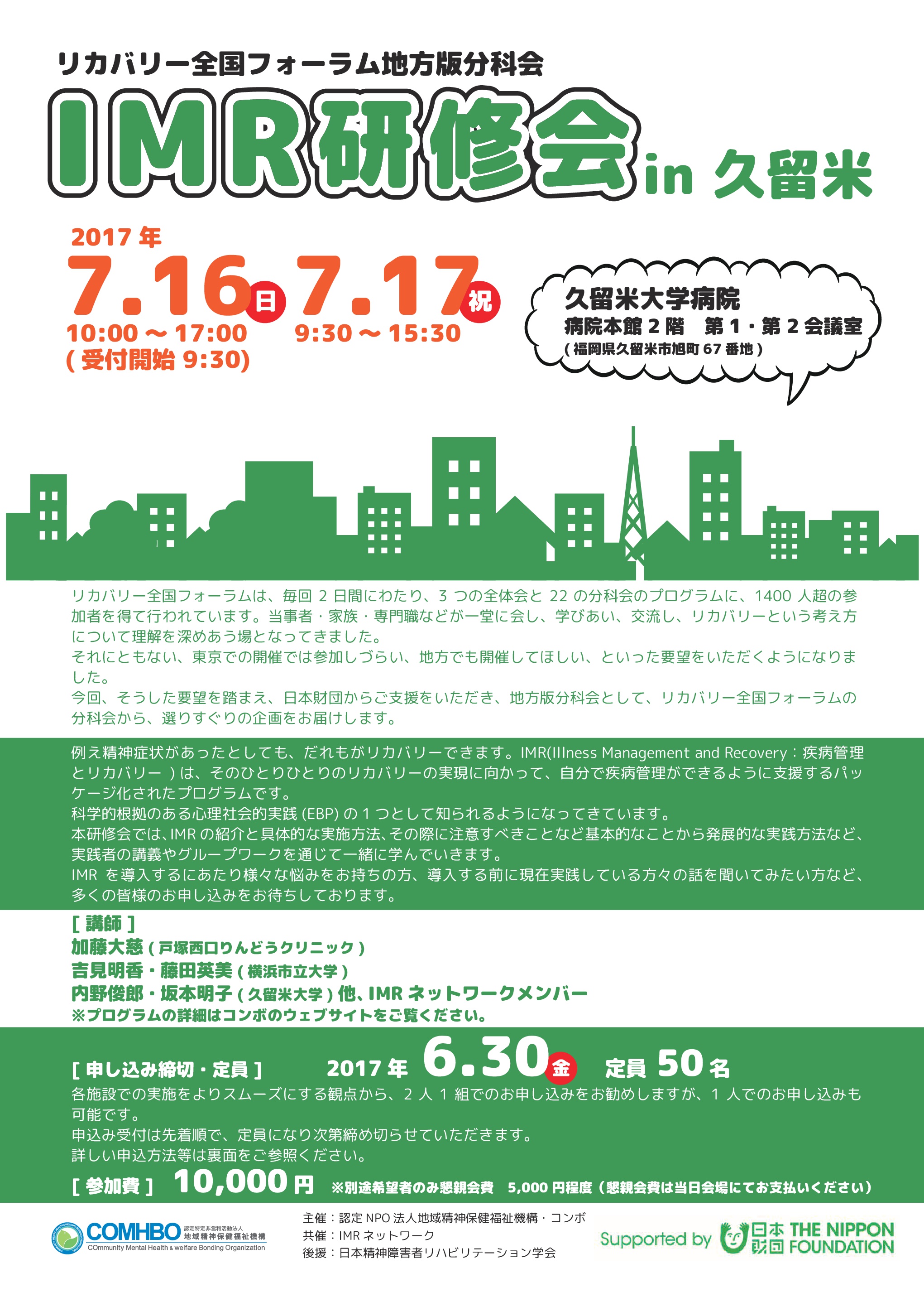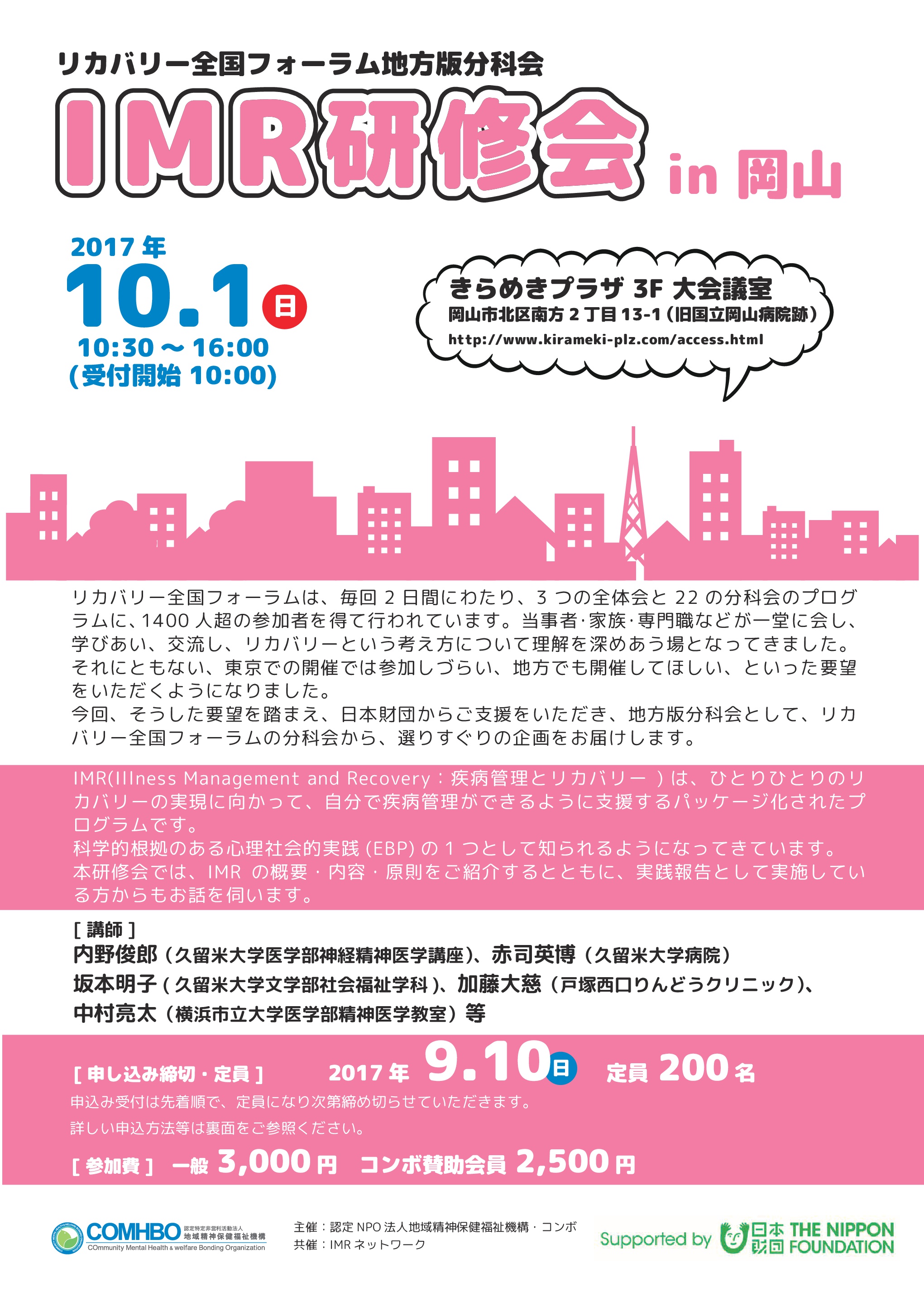 ブロック別IMR分科会in久留米 ブロック別IMR分科会in岡山 ブロック別IMR分科会in山梨 ブロック別家族支援分科会in大阪 ブロック別家族支援分科会in仙台 ブロック別家族支援分科会in福岡 の内、久留米から仙台までのチラシを登録しました。 (登録の制限が5件までとなっているため) Webサイトは、プライバシー保護のため、当法人の賛助会員限定となっています。 |