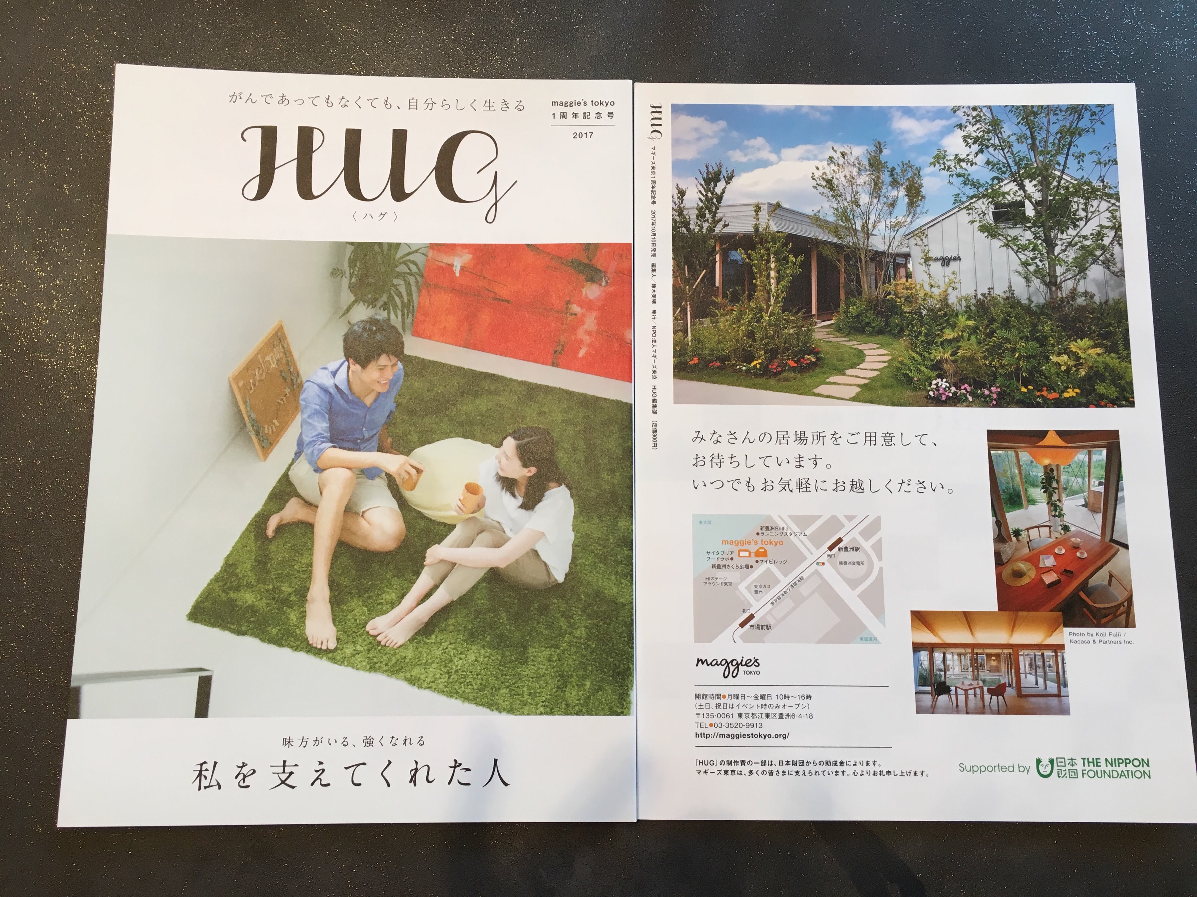 マギーズ東京の機関紙「HUG」は「がんであってもなくても、自分らしく生きる」をコンセプトに、マギーズ東京に来られない人にもその精神を届けたいと創刊された情報誌です。「HUG」による収入は、マギーズ東京の運営費と次号「HUG」の製作費に充てられます。