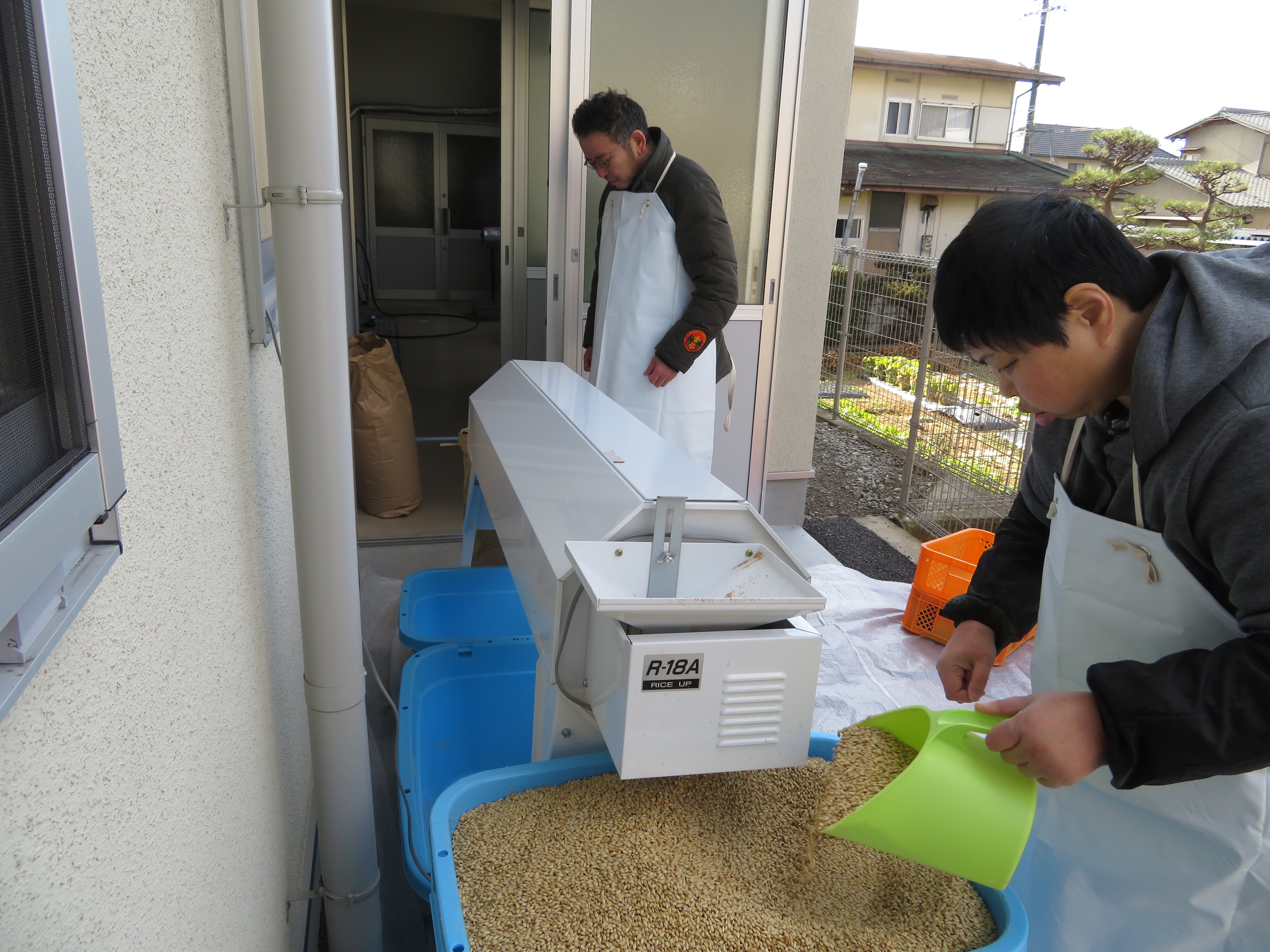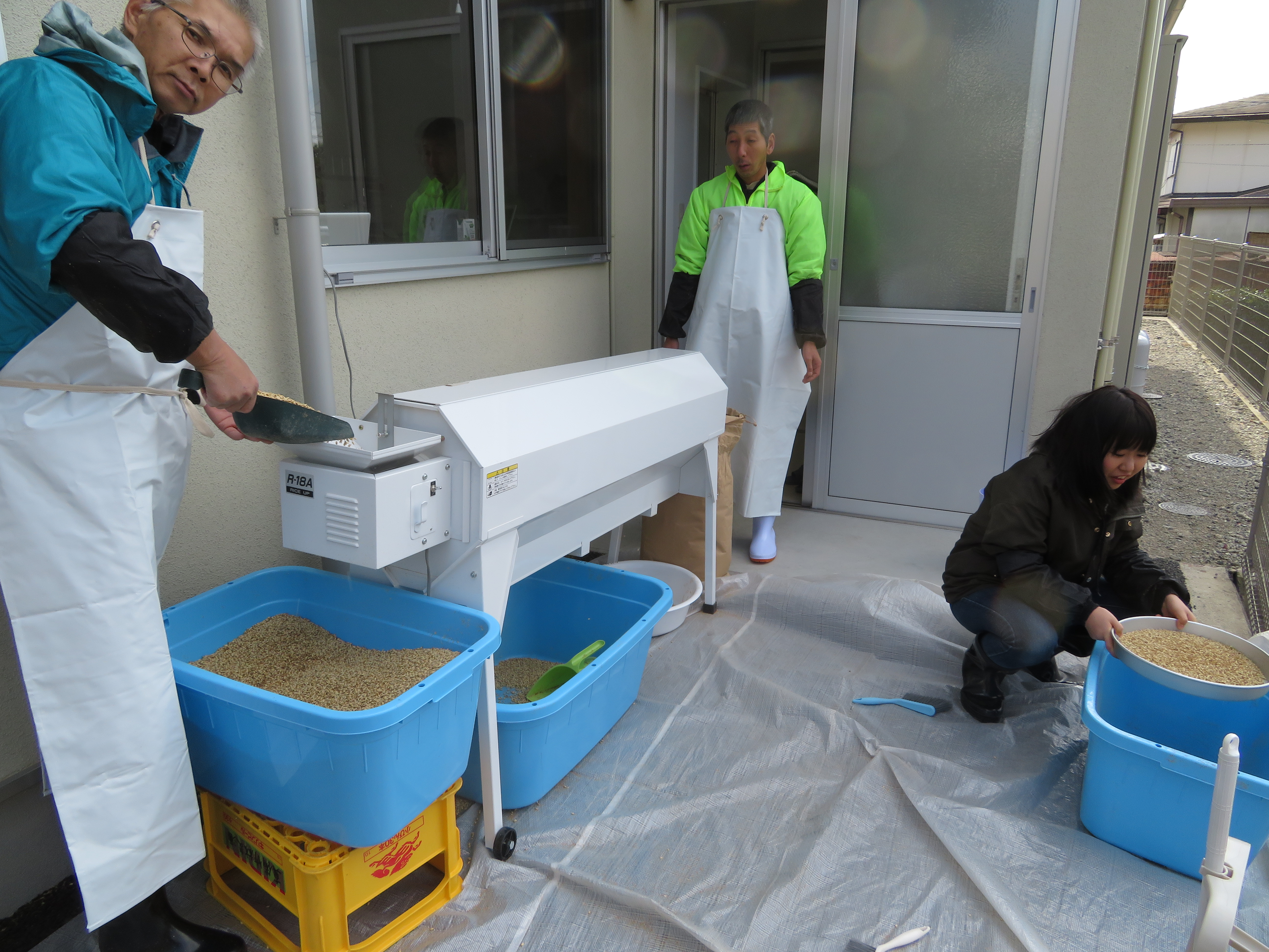 倉敷にある岡山大学資源植物化学研究所で開発されたビール大麦「はるな二条HKI]を倉敷地域で栽培し、その大麦を製麦して本物の地産地消の地ビールを作るための製麦プラントを備えた「マインド作業所」の建物写真と作業写真です。