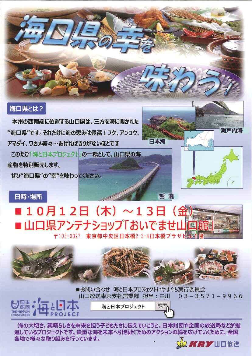山口県で海に関する様々な取り組みを可視化し、多様なキーパーソンと連携しながら プロジェクトのムーブメント化を図るため、以下の事業を実施。 1.山口県内70の企業・団体を「海と日本プロジェクト推進パートナー」として 登録を達成する渉外活動、及び、推進パートナーとの6の連携事業を実施 2.山口県内9市長・1町長を、ムーブメントの熱源となりうるキーパーソンとして 選定。キーパーソンを紹介する15秒動画を10タイプ(本)制作・放送。 また、海と日本プロジェクト公式ウェブサイト掲載用に8市長・1町長から 海に関するメッセージ文を取得。 3.選定のキーパーソンの海への想いを訴える、2分を超えるインタビュー動画を 10タイプ(本)制作・配信。 4.山口県内の海関連イベントや海洋危機問題を取り扱う2分以上の取材動画の 「海応援動画」を30取材し、制作・放送。 5.「海と日本プロジェクトinやまぐち」公式ウェブサイトにて、県内の海に関連 する活動やイベント等を取材、102本記事化し配信。 6.山口県の海が持つ特徴を子供たちが主体的に学ぶことができるオリジナルイベント 「 いでよ!海維新の志士(海の出前授業・海維新サミット) 」を実施。 参加の子供達による山口県知事への提言も実施。イベントの内容を取材した読売新聞 海維新サミット特集特別号(タブロイド版)を発行。県内の全小学校(291校)の 5・6年の児童等、24,000部配布。 7.山口県内にて「海と日本プロジェクト・全国展開をする事業」とのコラボイベントを実施。 (Amazon×父の日、海でつながるごみ拾い、うみぽすグランプリ2017、うみダンス・紙芝居、 さばける塾、シージョブキッズ、ソーシャルイノベーションニュース、 東京発信イベント・おいでませ山口館「海口県の幸を味わうフェア」実施) |