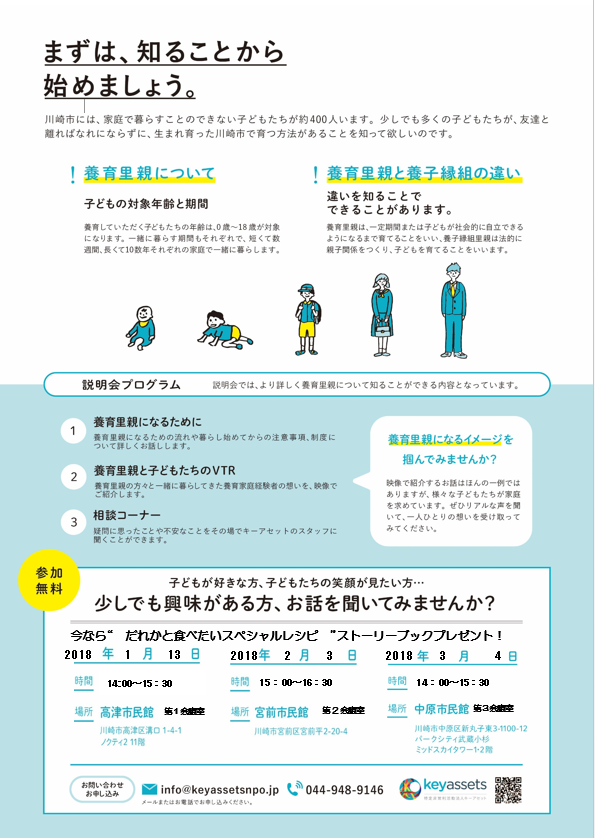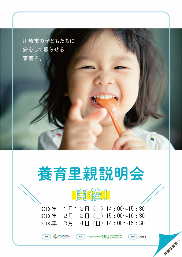 (2)東急高津駅、梶が谷駅にてポスターを掲示して、里親制度及びキーアセットの周知を行った。 (3)養育里親説明会及びポスティングによる周知のためのチラシを作成した。 |