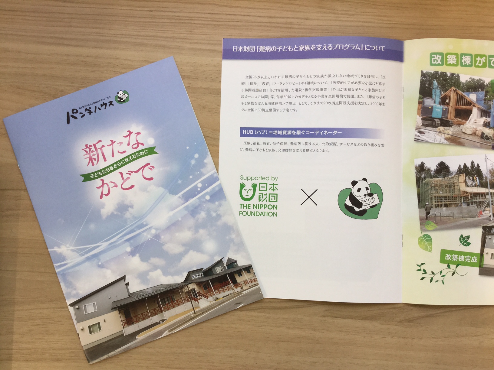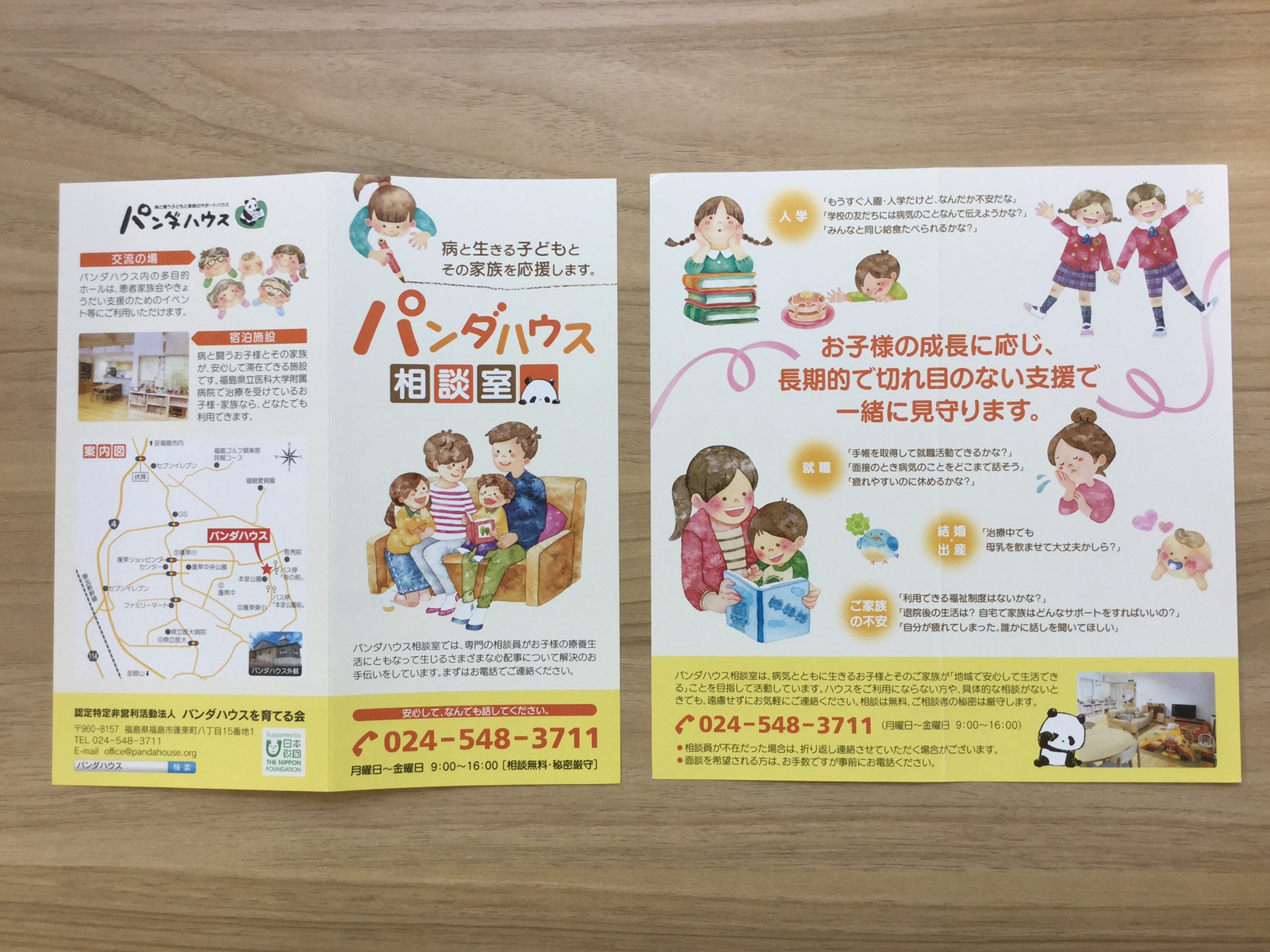 当団体の20年の歩みと、2017年度から新しく相談事業を開始した理由や内容を、建て替えたハウスの紹介と共にまとめた冊子。 2.パンダハウス相談室リーフレット: 新しくはじめた相談事業について、対象の方に向けて説明したリーフレット。どのような相談を受けられるのかや、相談受付方法を記載した。また、このリーフレットに併せて、対象の方に身近に感じてもらえるように、相談受付の電話番号を記載したクリアーファイルやマグネットシートを作成して配布した。 3.公開座談会チラシ: 慢性的な経過をたどる子どもを支援するためには、他機関との連携が必須であるため、連携体制を作る第一歩として、関係機関と公開座談会を実施した。 4.ニュースレター: 当団体の活動をまとめたもので、年に1~2回作成し、会員さんはじめ地域の方に配布している。 5.募金箱: 福島県内を中心に(関東圏、宮城県も含む)、多くの方に設置してもらっている。ハウスの形をした広報を兼ねた募金箱であり、今後も設置していただける方を増やしていく予定である。 6.相談事業ホームページの立ち上げ(ホームページリニューアル): 既存のホームページに、新たに「パンダハウス相談室」としてページを立ち上げ、「相談窓口」、「闘病中の思い(動画)」、「施設紹介」を掲載した。 |