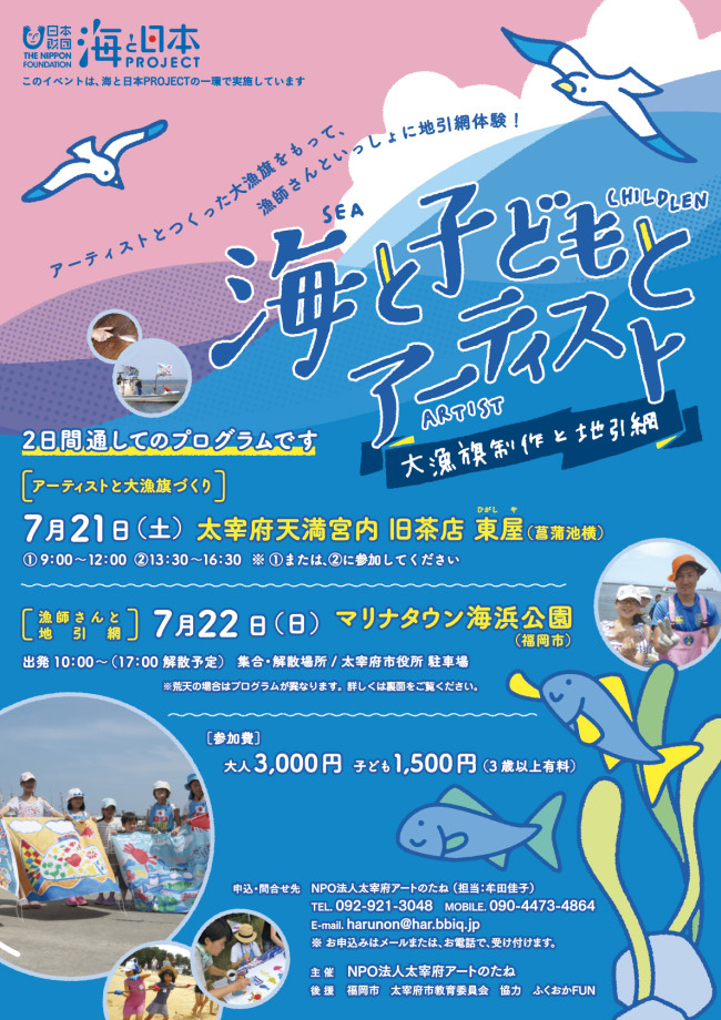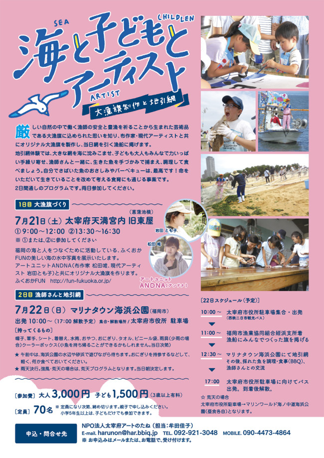 今回は、福岡の美しい海の写真をとり続けているふくおかFUNから、珍しい水中写真などを展示します。旗づくりのヒントになることでしょう。 漁師体験では、大きな網を海に沈みこませ、子どもも大人もみんなで力いっぱい手繰り寄せ、漁師さんと一緒に、生きた魚を手づかみで捕まえ、調理して食べます 生きたお魚に触れるなんてワクワクします 自分でさばいた魚のお刺身やバーベキューで。 命をいただいて生きていることを改めて考える食育にも通じる事業 2日間通してのプログラム ★7月21日(土)オリジナル大漁旗づくり 太宰府天満宮 アートユニットANDNA(布作家 松田唯、現代アーティスト 岩田とも子)と共にオリジナル大漁旗を制作 ★7月22日(日)漁師さんと地引網 福岡市 |