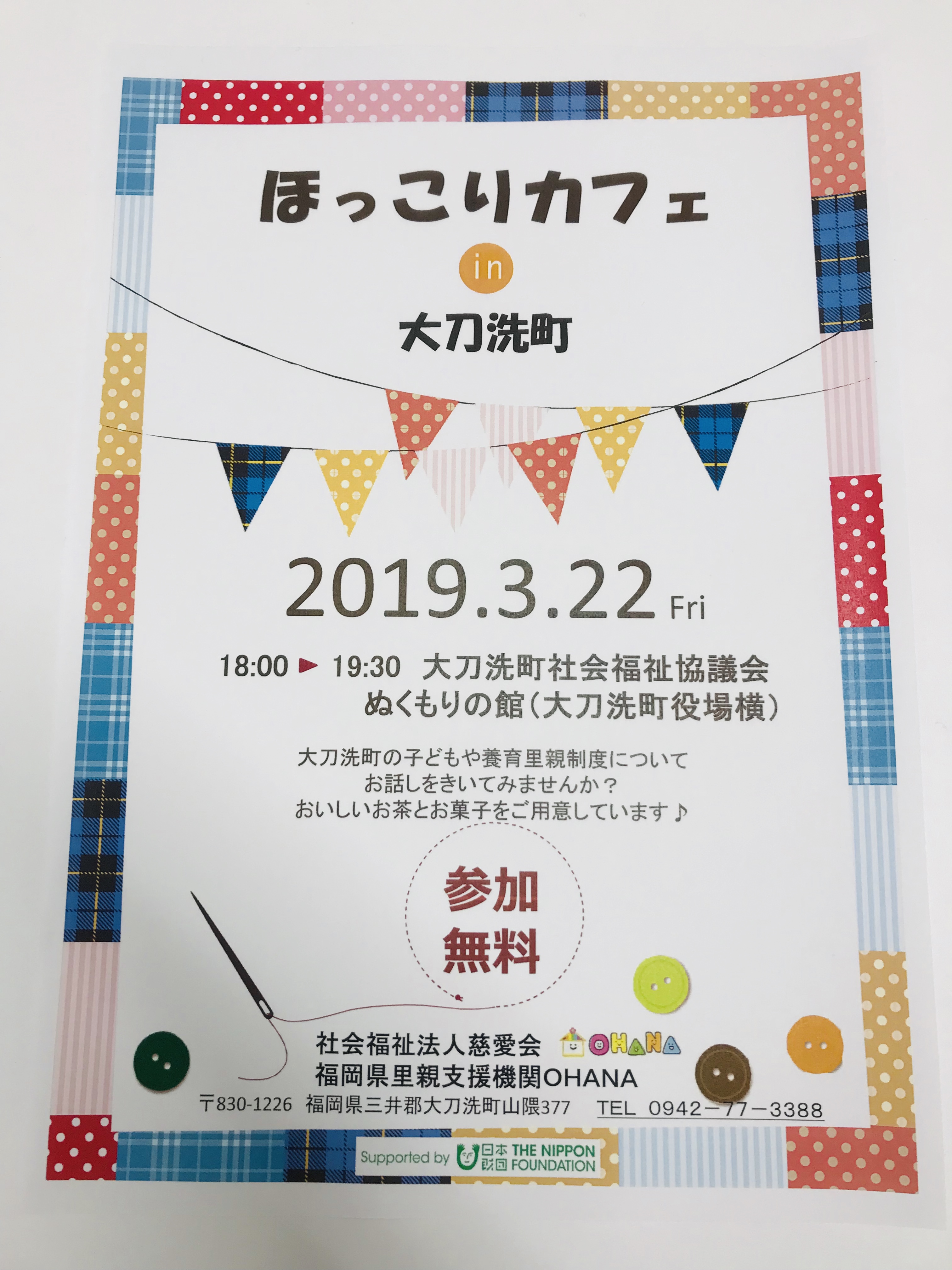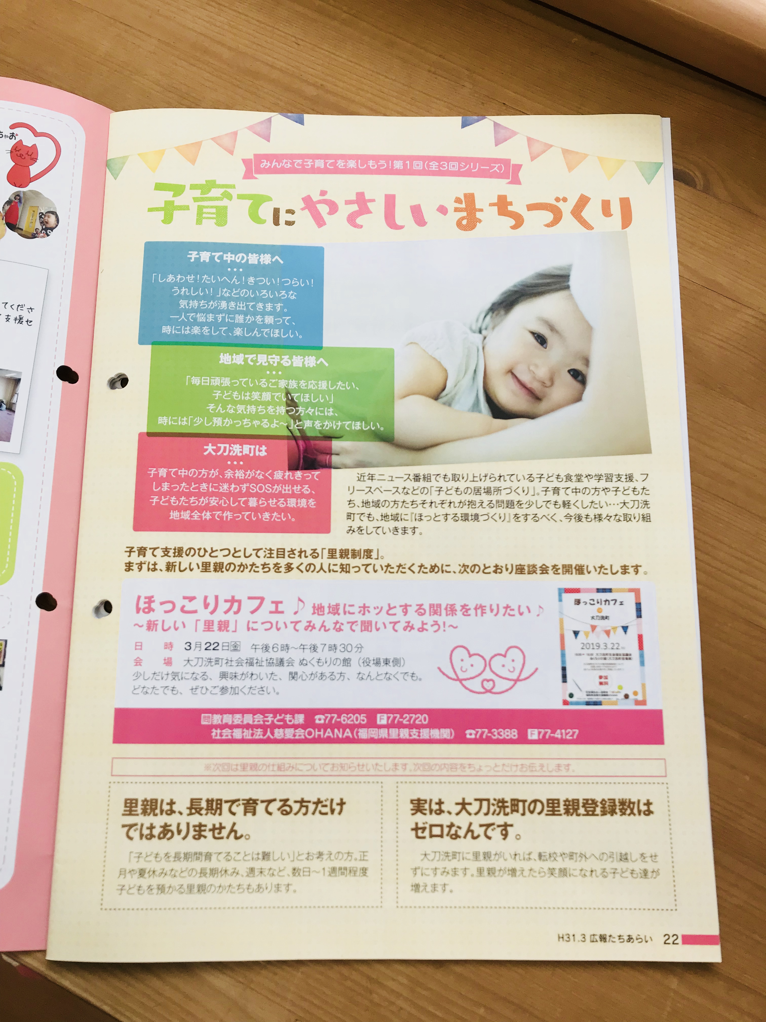 2019年3月22日(金)大刀洗町と協働で子育てのカフェを開催。里親の話を3回シリーズで(3月、5月、7月)で行っていきます。そのため、大刀洗町の広報誌に掲載。また、うちのチラシを回覧板で全戸配布等をさせて頂いています。そのチラシと広報誌の掲載分です。