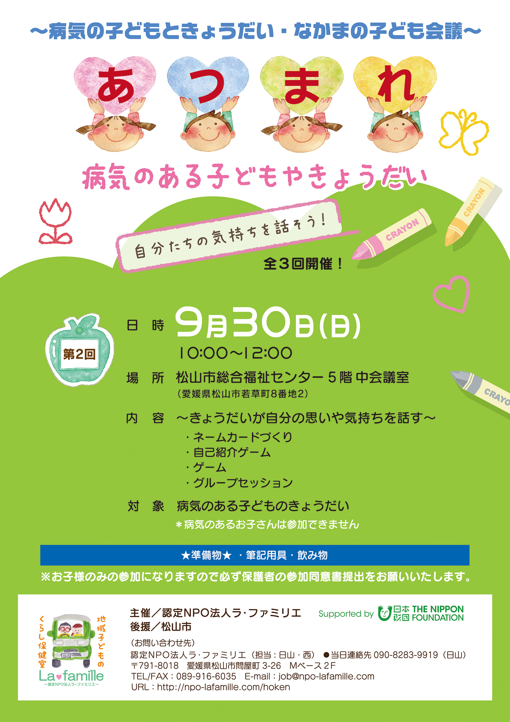 子どもの権利条約にある「参加する権利」を念頭に、意見を述べたり、集会を開いたりすることを目指し、前3回を行った。 第2回(2018年9月30日予定) ・対象:病気のある子どものきょうだい ・テーマ:「自分たちの気持ちを話そう」 ・参加者募集チラシ:A4表裏カラー |