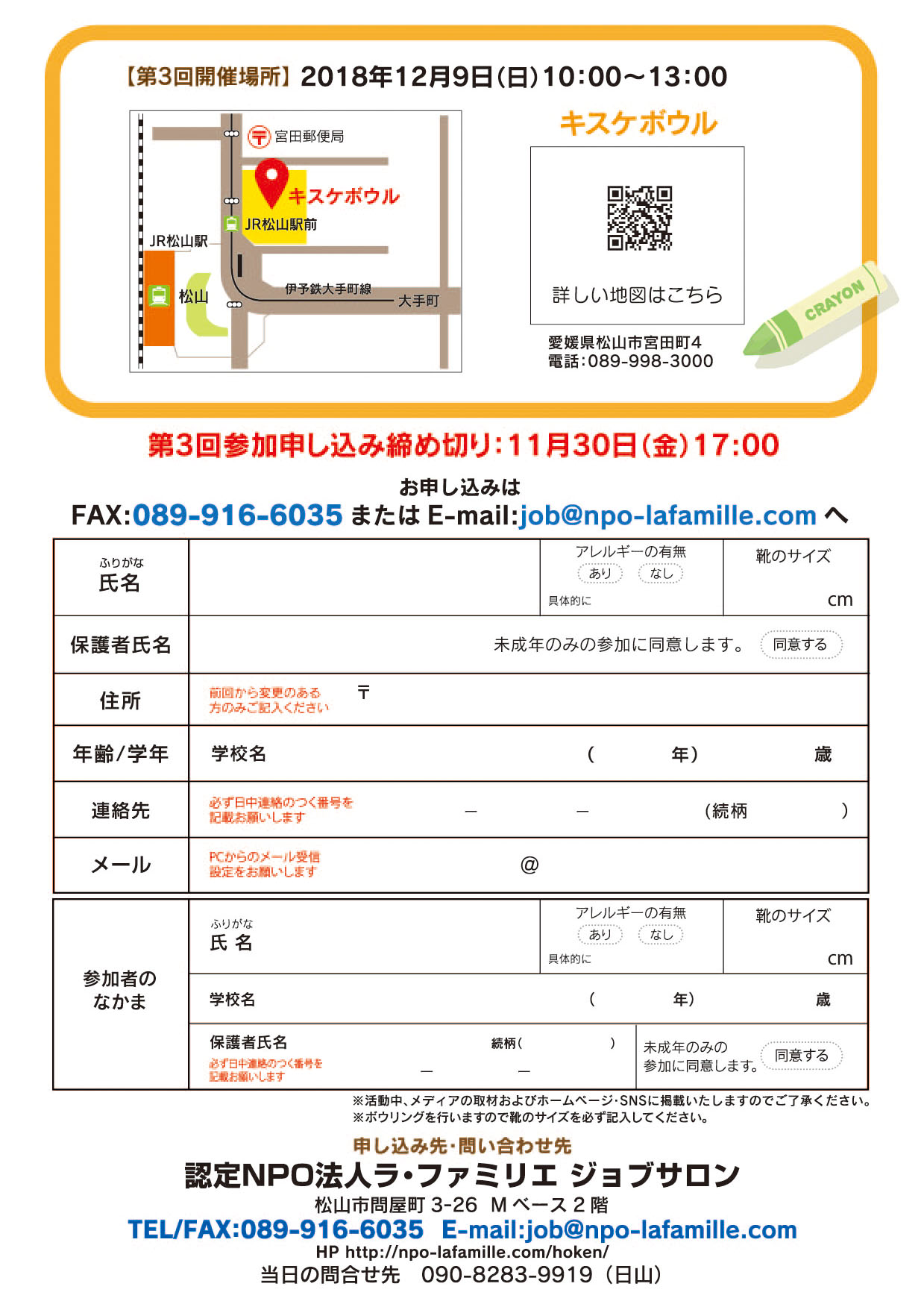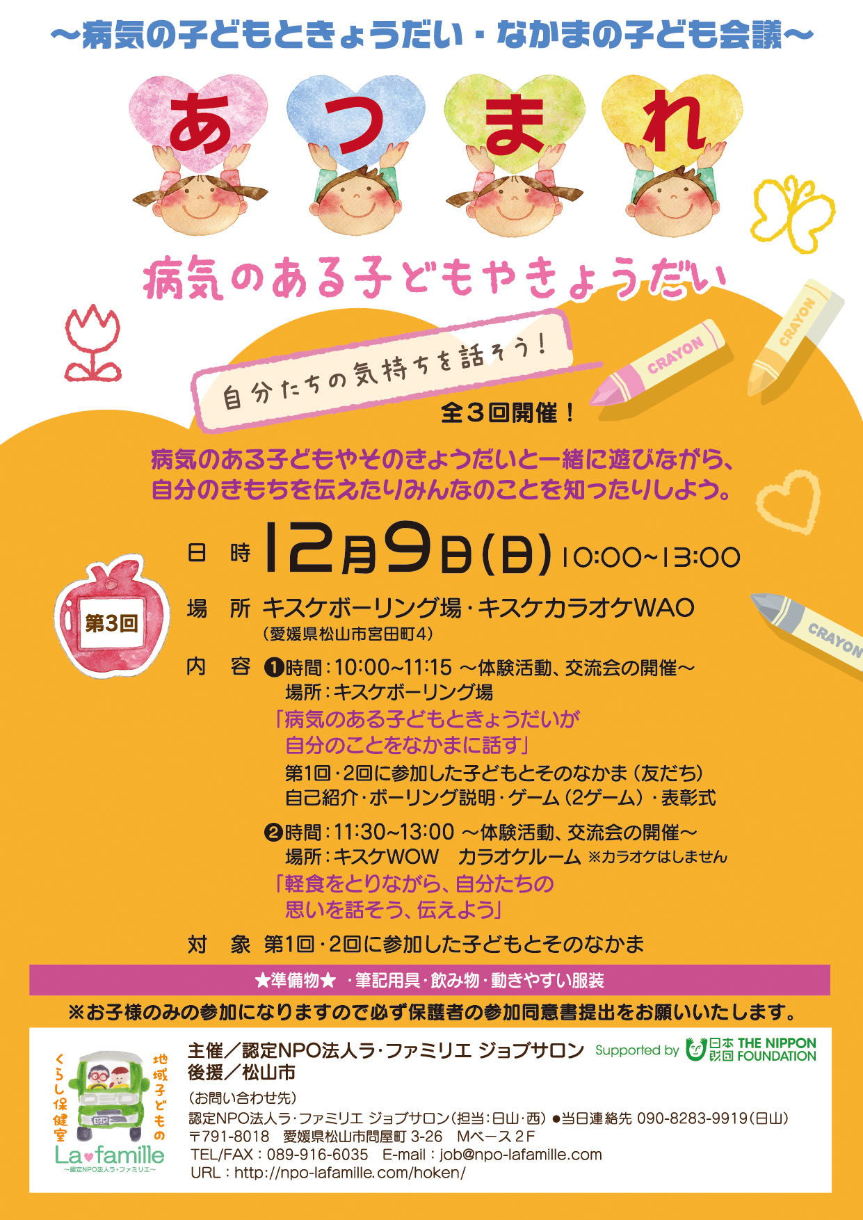 子どもの権利条約にある「参加する権利」を念頭に、意見を述べたり、集会を開いたりすることを目指し、前3回を行った。 第3回(2018年12月9日) ・対象:病気のある子ども、病気のある子どものきょうだい、そのなかま ・テーマ:「自分たちの気持ちを話そう」 ・参加者募集チラシ:A4表裏カラー |