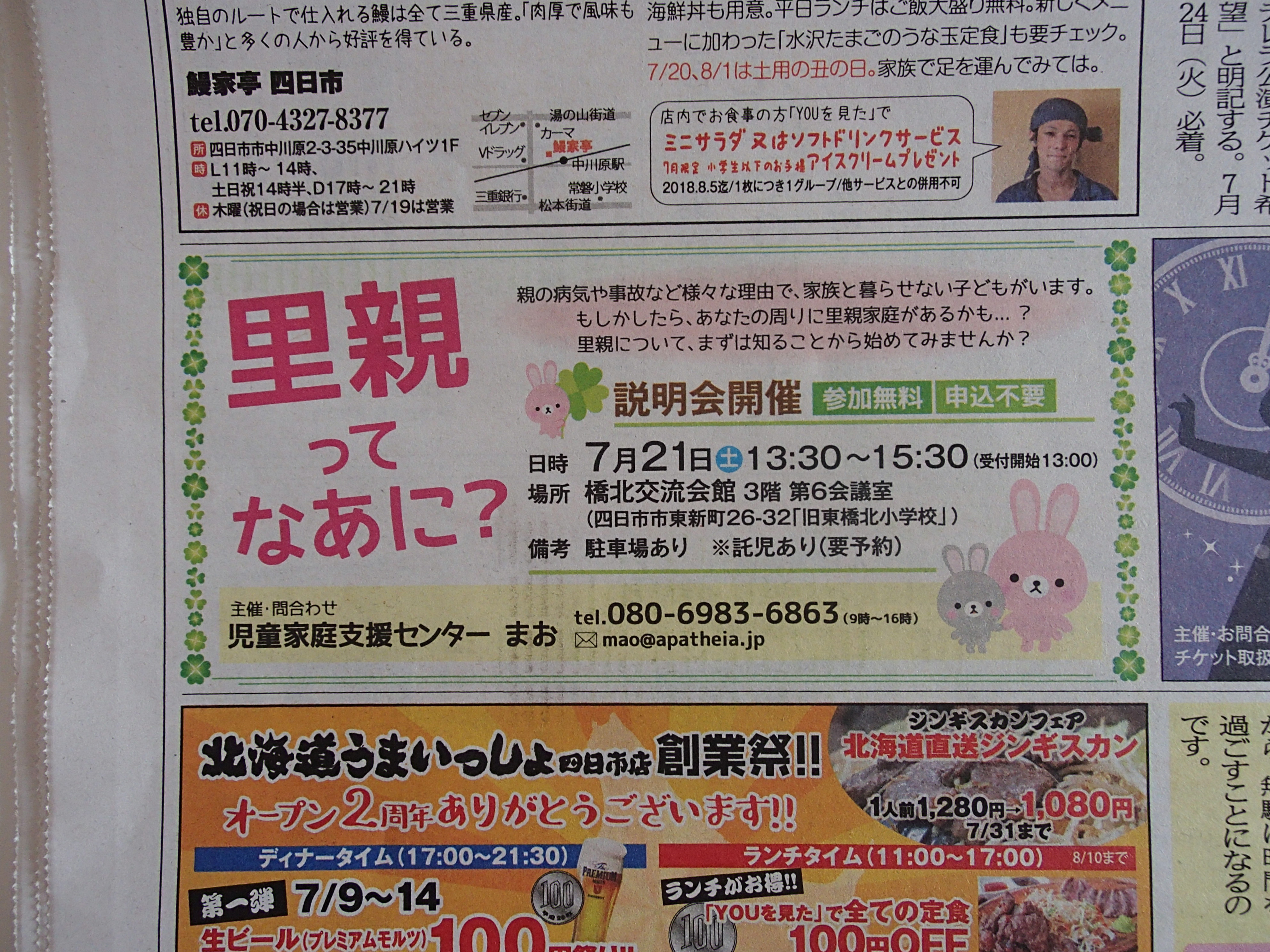 第1回 里親制度説明会 2、日時 2018年 7月21日(土)13:30~15:00(受付開始13:00) 3、会場 橋北交流会館 3階 第6会議室 三重県四日市市東新町26-32「旧東橋北小学校」 4、主催 アパティア福祉会 児童家庭支援センターまお |