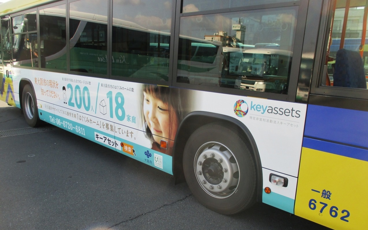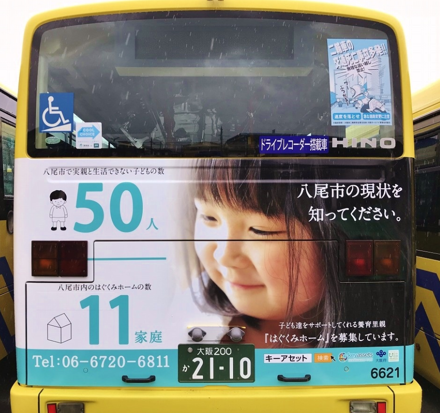 〇八尾市内において「はぐくみホーム」による養育促進とキーアセットの周知を図るため八尾市内を走る近鉄バスの車体右側面部分の広告を行った。 |