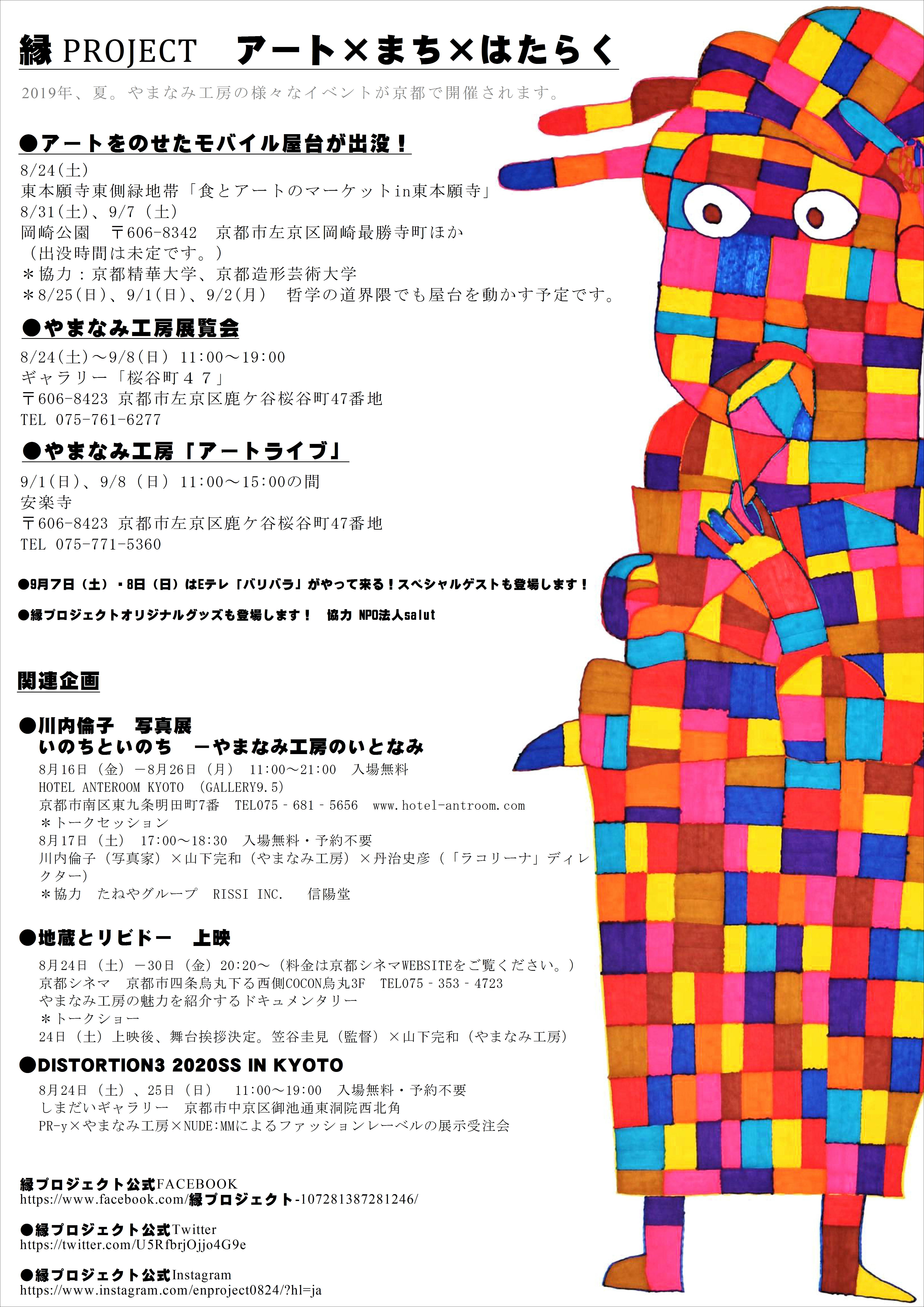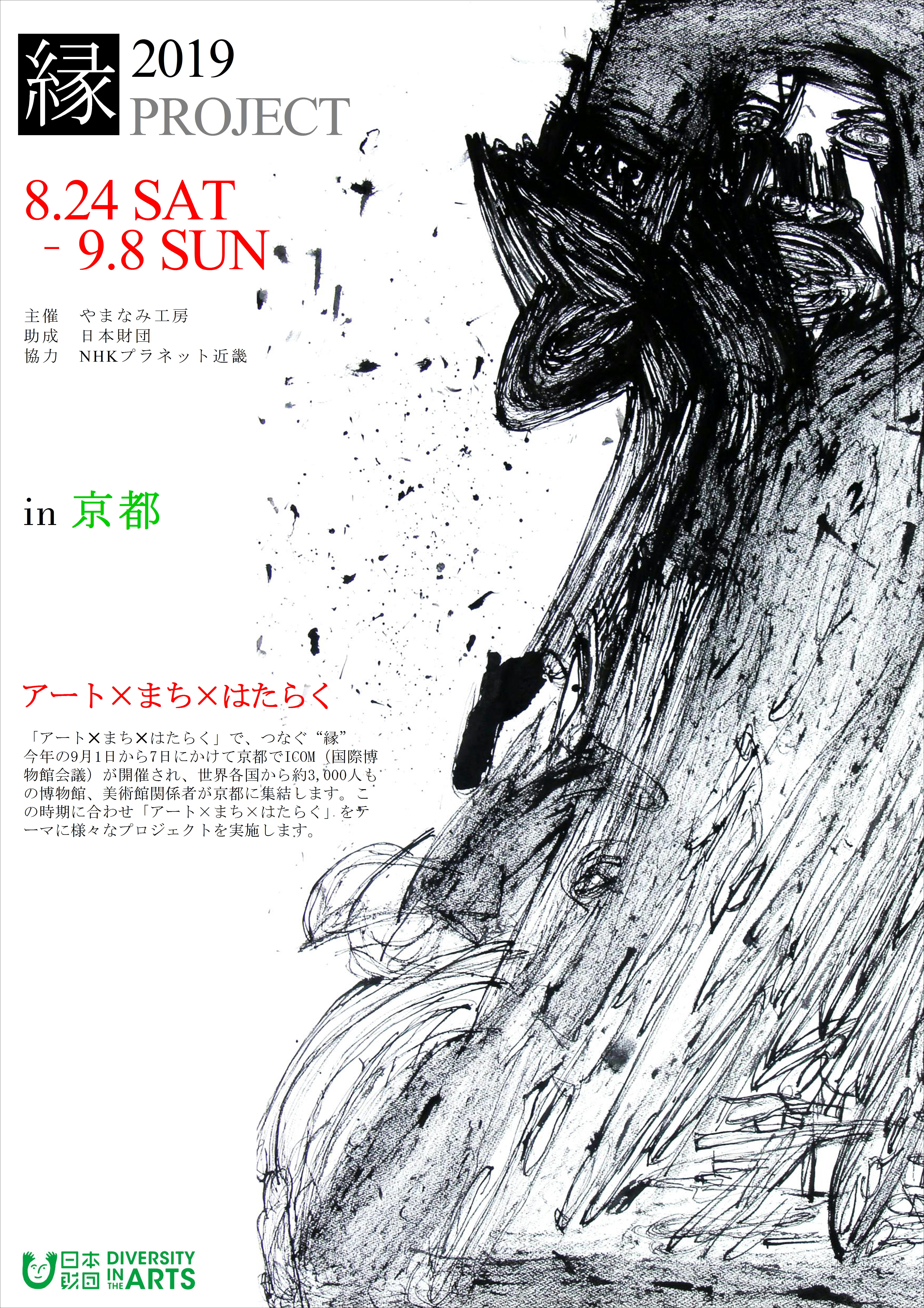 1.障害者アートを通じた大学生の福祉教育モデルの構築 (1)時期:2019年7月23日~2020年1月31日(報告書配布完了日時) (2)参加者:大学生20名(京都造形芸術大学、京都精華大学、大阪人間科学大学) (3)参加施設:やまなみ工房(滋賀)、SALUT(京都) (4)内容: a.研修 時期:2019年7月~8月 回数:5回 内容:障害者アートについて概況(作家、作品、制作環境等)、ディレクションについて 参加者(京都造形芸術大学、京都精華大学、大阪人間科学大学、NHKプラネット近畿、Salut、ファイル、やまなみ工房) b.企画 時期:2019年7月~8月 回数:10回 内容:企画展の検討(テーマ、作品、展示方法、広告、場所等) 参加者(京都造形芸術大学、京都精華大学、大阪人間科学大学、NHKプラネット近畿、Salut、ファイル、やまなみ工房) c.企画展 時期:2019年8月~11月 ① (京都 食とアートのマーケット in 東本願寺) 開催日/8月24日(土) 場 所/東本願寺前緑地帯 来場者数/50名(一般) 縁プロジェクトのプレイベントとして参加。フリ―マーケットのため、グッズ販売を中心としたモバイル屋台を設置。チラシ配布等、縁プロジェクトの告知も行う。 ② (ロームシアター京都)(京都マムフェス) ロームシアター京都 開催日/8月31日(日) 場 所/ロームシアター前広場 来場者数/30名(一般) 京都マムフェス 開催日/9月7日(日) 場 所/岡崎公園 来場者数/123名(一般) ロームシアター京都では、プロジェクトのPRで京都造形芸術大学の屋台が出展、京都マムフェスにおいては、すべての屋台が出展される。 岡崎公園では、陶芸のワークショップやNHK Eテレ「バリバラ」の取材で、タレントのりゅうちぇる氏が参加する等、多くの方が屋台に訪れる。また屋台も移動しながら道行く方に作品をPRした。 ③ (ICOMソーシャル・イベント 岡崎エリア会場) 開催日/9月5日(木) 場 所/京都国立近代美術館前 来場者数/103名(一般、ICOM関係者) ICOMに参加する各国の博物館、美術関係者にPRする。限られた時間であったが、モバイル屋台や作品に感心を示される外国の方等、多数おられ、このプロジェクトを知ってもらえるよい機会となる。 ④ (哲学の道) 開催日/9月1日(日)、8日(日) 場 所/レンタルスペースアイム 来場者数/1日90名、8日61名(一般) 銀閣寺を訪れる観光客をターゲットにPRする。2日間とも大学生とやまなみアーティストがリーフレットの配布や、宣伝等積極的に参加。やまなみアーティストも率先して作品紹介をする等、日常とはまた違う表情を見せる等、たくさんの方とのつながりが生まれる。 ⑤ (安楽寺) 開催日/9月1日(日)、2日(月) 場 所/安楽寺 来場者数/1日80名、8日120名(一般) 安楽寺内において、京都精華大屋台を出展。大阪人間科学大学の学生が来場者に作品説明とグッズ販売PRを行う。1日にはやまなみアーティストによるアートライブと、カフェスペースも設けられランチやドリンク等で多くの賑わいをみせた。 ⑥ (ギャラリー桜谷町47) 開催日/8月24日(土)~9月8日(日)※8日のみアートライブ・モバイル屋台出展 場 所/ ギャラリー桜谷町47 来場者数/275名(一般) 縁プロジェクトの期間中、やまなみ工房アーティストの作品を鑑賞できる場として開催する。安楽寺や哲学の道に来られた観光客や縁プロジェクトを目的に来館される方等、幅広い層に知っていただく機会となる。最終日には、アートライブも開催、アーティストが会場で作品制作を行い作品が生まれる過程や、彼らの日常の様子を紹介できる。 (町家カフェ アートギャラリー) 9/3(火)~/8日(日) コーディネートディレクションとしてファイル・和田氏に協力いただく。京都市内の町家カフェ店内において、縁プロジェクト期間に合わせやまなみ工房の作品を展示する。 美術館やギャラリーで作品を鑑賞するだけでなく、作品が自然に地域や環境に溶け込み、誰もが気軽にアートを楽しめ、人と人、人と地域を「アート」でつなぐことを目的に開催した。 ⑧ 「アイタルガボン(カフェ)」 京都市上京区中町通丸太町上ル俵屋町435 メインビジュアルや今回の縁プロジェクトのオリジナルグッズにも使用された田村拓也の作品をメインに展示する。カラフルな色彩の作品が通常のお店とは違った雰囲気をつくる。 出展作家/ 田村拓也 山際正己 大原菜穂子 来場者数/ 約190名(一般) ⑨ 「ことばのはおと(カフェ)」 京都市上京区天神北町12-1 古民家を改装した店内、鉄道模型等、店主の趣味がたくさん詰まった中に自然に溶け込むような作品をセレクトする。電車に関連した作品や、土人形を本棚やテーブル、庭等に散りばめお店全体を使って展示を行う。 出展作家/ KATSU 木村圭吾 山際正己 大原菜穂子 来場者数/ 約100名(一般) ⑩ 「スゥレッド カフェ」 京都市上京区上立売道小川東入る西大路町58 白をベースにした明るい店内にモノクロや色鮮やかな物等、作風の違うバリエーション豊かな作品をそれぞれ展示する。店内の雰囲気に溶け込むような作品からじっくりと鑑賞できるような細かく描き込まれた作品等、いろいろな楽しみ方ができる展示をイメージする。 出展作家/ 岩瀬俊