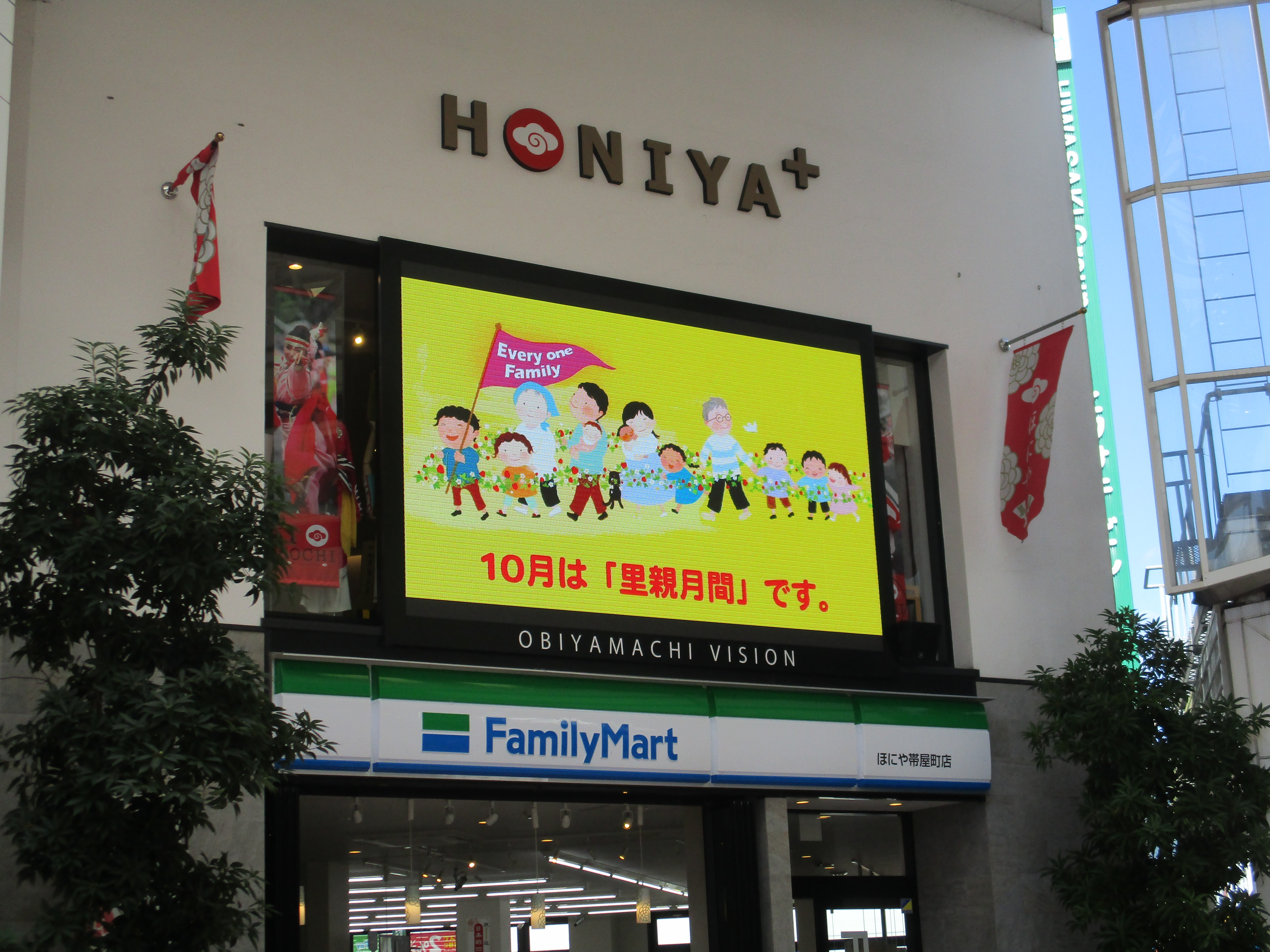 10月の里親月間に合わせ、高知市の中心街である帯屋町商店街のほにや本店のビジョンを利用し、里親制度啓発のCMを流した。