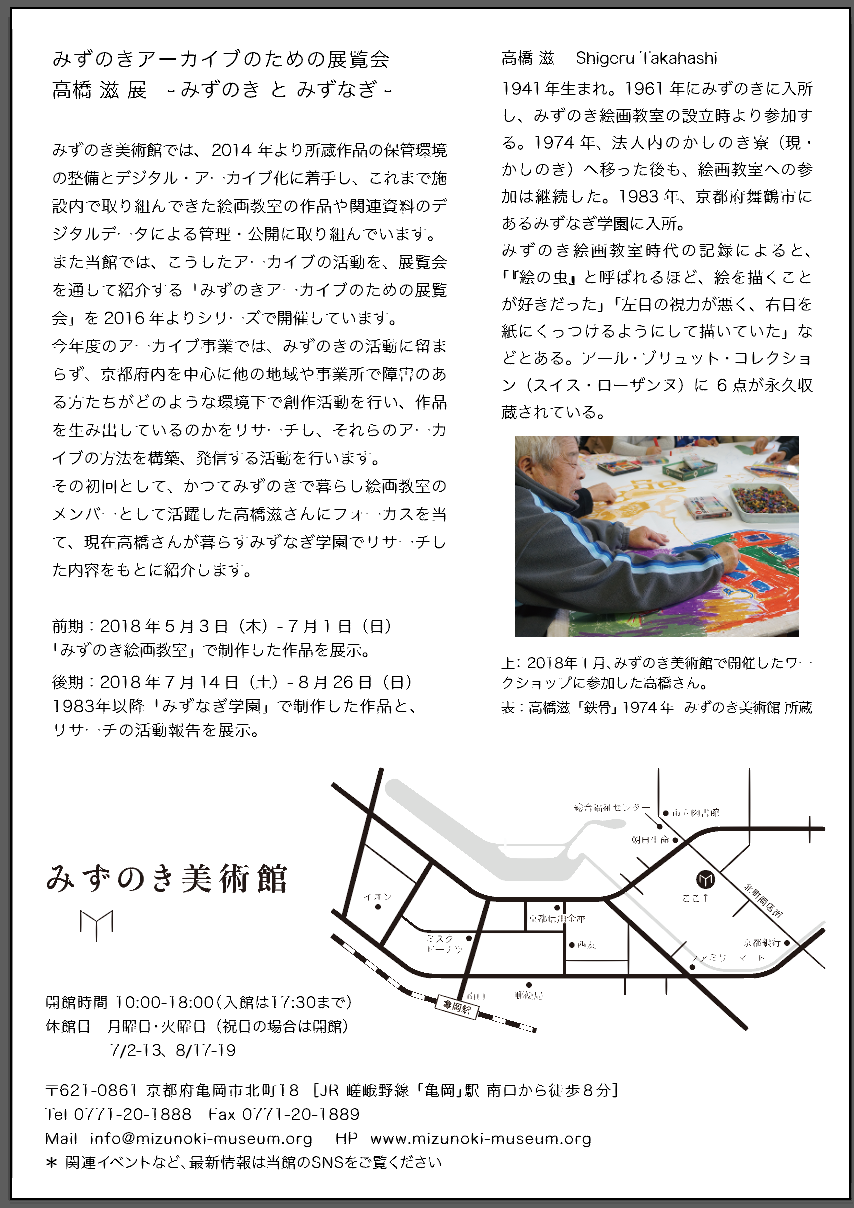 2018年度「みずのきアーカイブのための展覧会 –高橋滋展 みずのきとみずなぎ」フライヤー