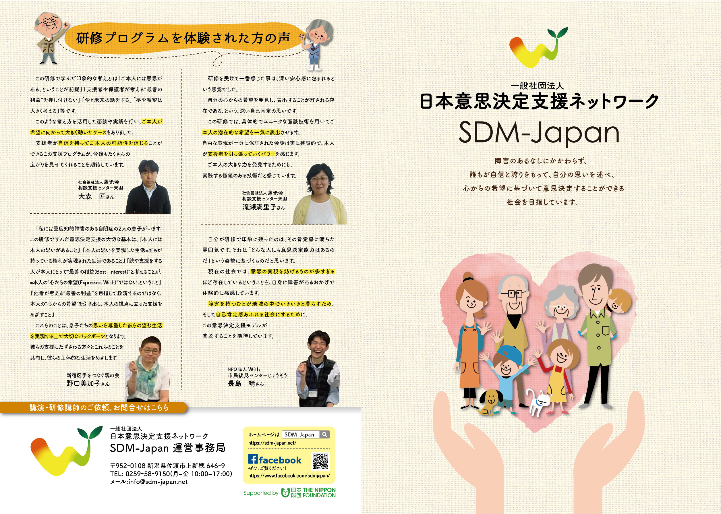 日本意思決定支援ネットワーク(SDM-Japan)の基本的な考え方、めざすところ、事業内容などをわかりやすく紹介する。二つ折り、4ページ。