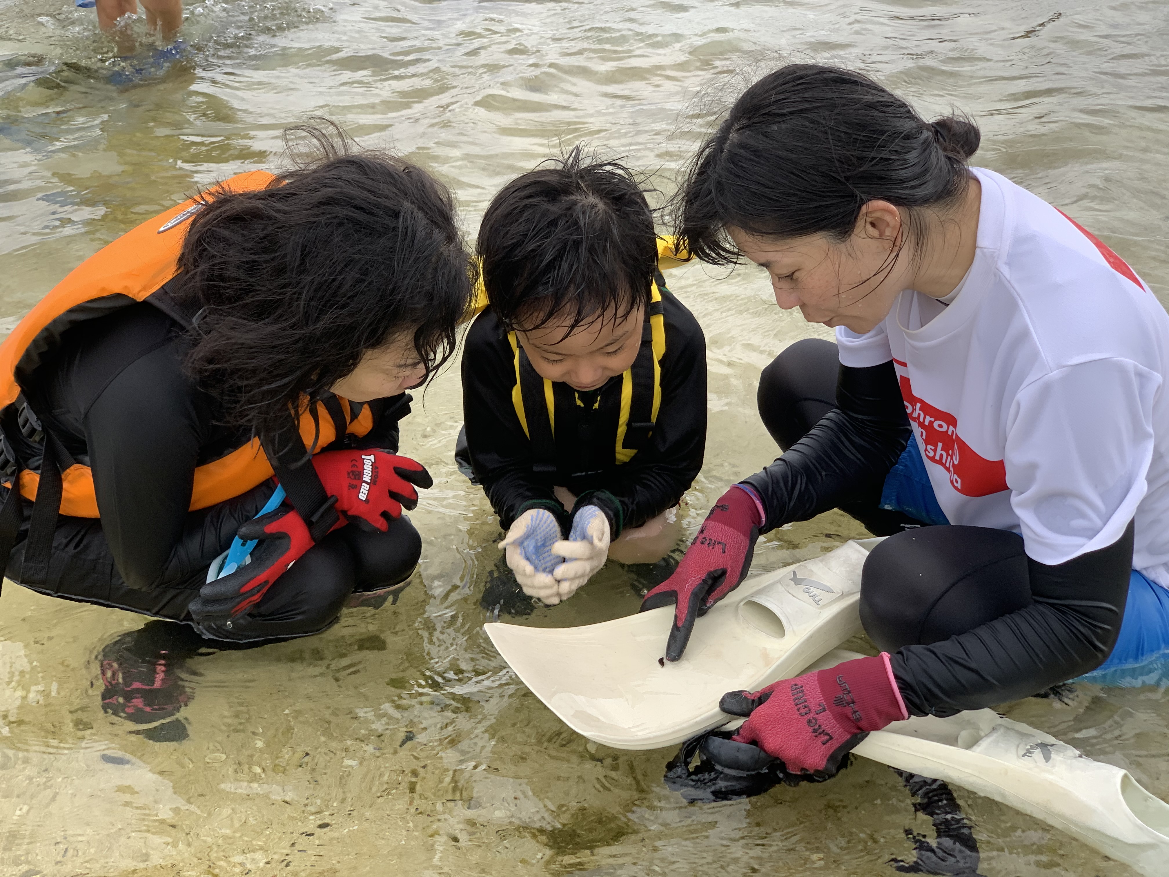 そこで、この金見のイノーをフィールドとして、生物の専門家の指導の下で生物調査の活動を行いました。 その活動の、様子です。 |