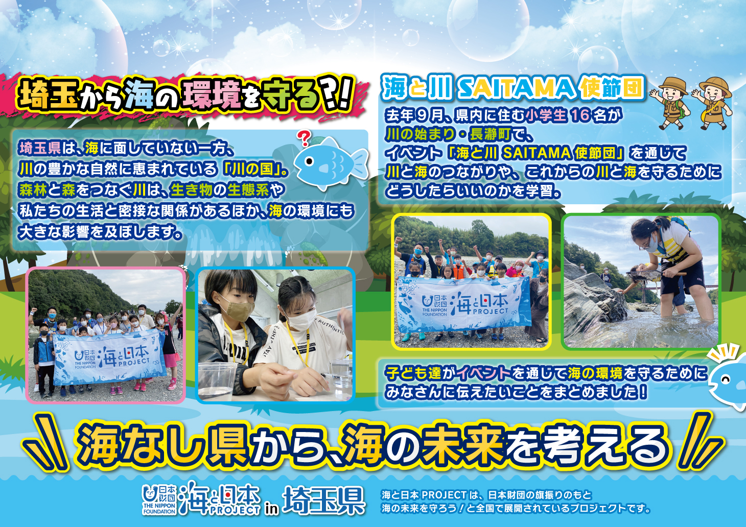 海と日本プロジェクトin埼玉県のオリジナルイベントで参加者が制作したイラストをもとに制作したポスター3種類。