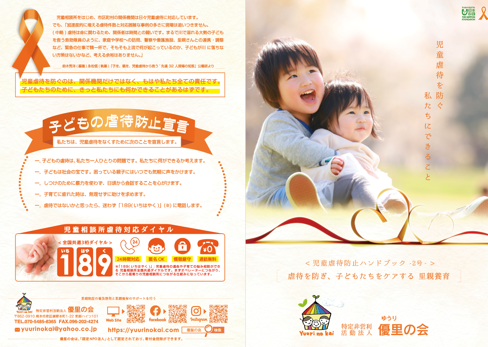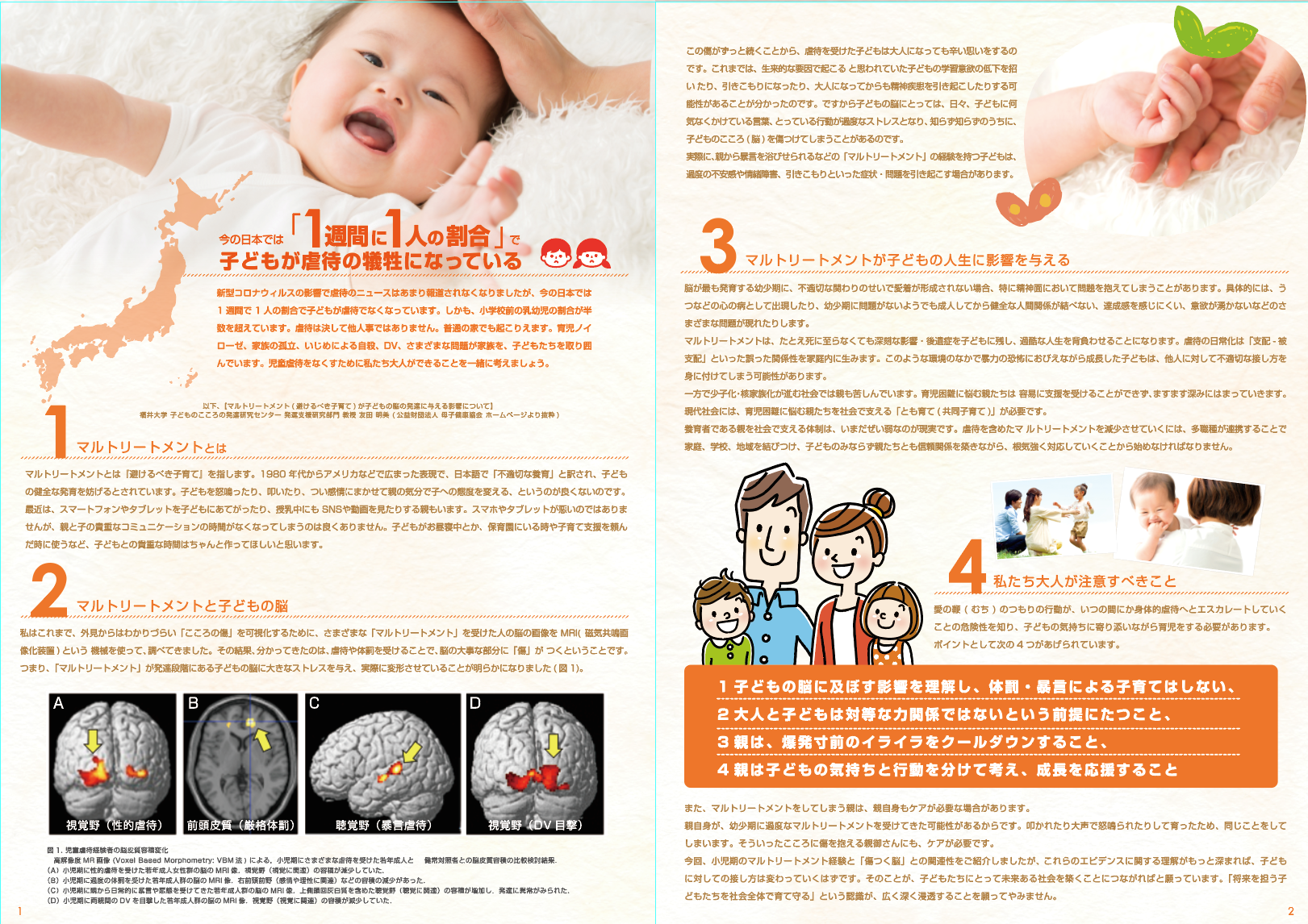 【内容】 ・マルトリートメントとは ・関係者からのメッセージ ・児童虐待の現状、事例からわかること ・あなたの子育てはどのタイプ? ・里親制度の意義 ・里親の養育体験談 ・子どもの虐待防止宣言 |