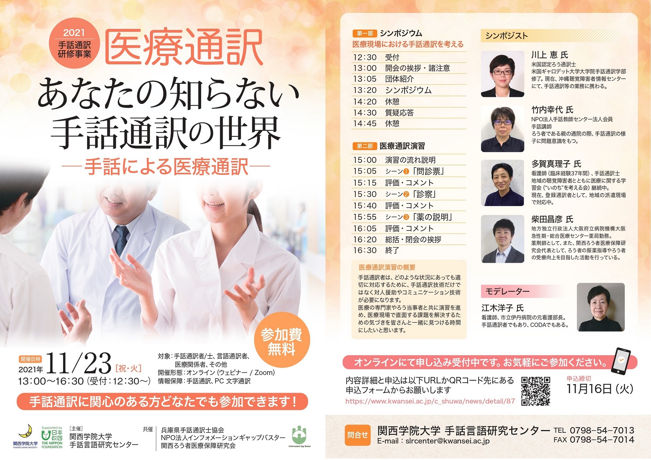 主催:関西学院大学手話言語研究センター 共催:兵庫県手話通訳士協会、NPO法人インフォメーションギャップバスター、関西ろう者医療保障研究会 |