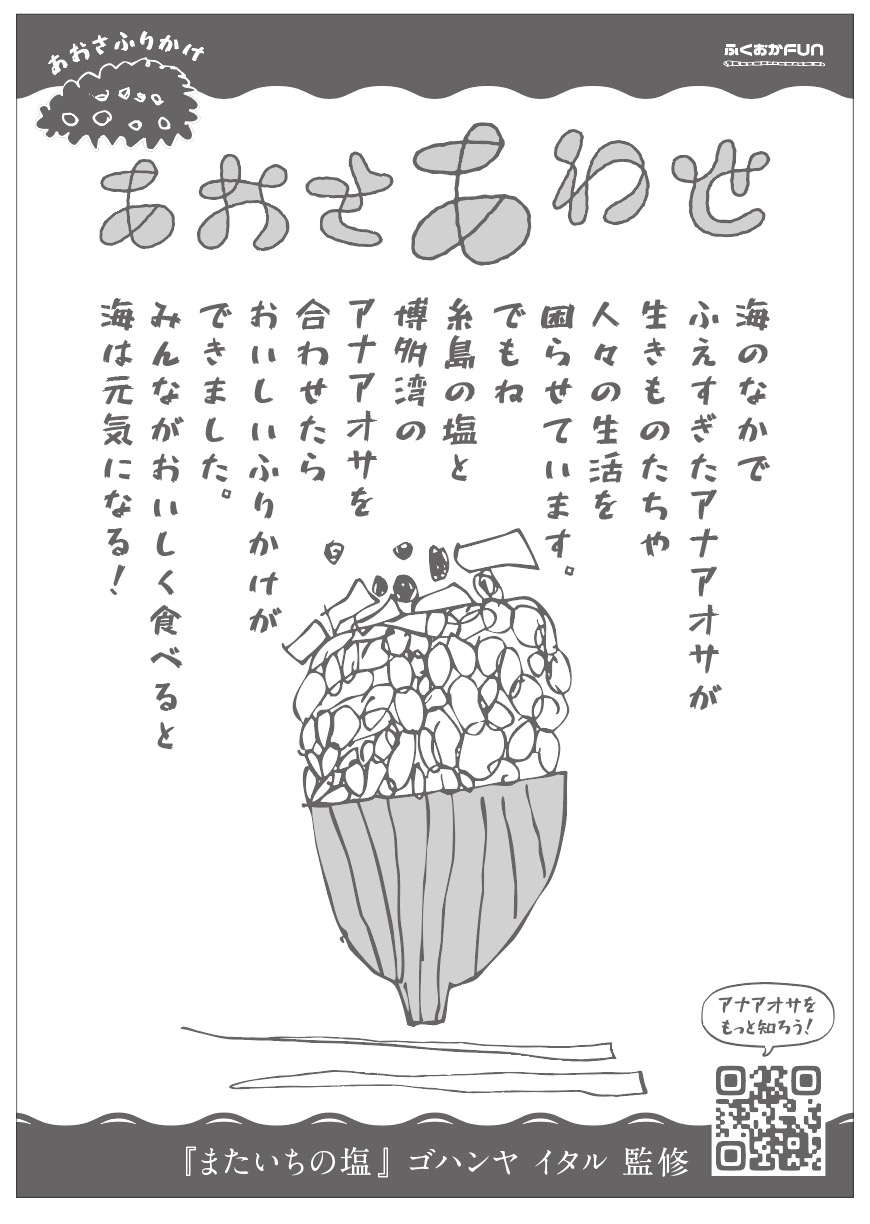 ふくおかFUNが行う【ボクらの海のお困りごとみんなでカイケツ!大作戦(海と日本2021)】において、海藻アオサの実用化(商品化)に向けた取り組んだ結果、開発した商品(ふりかけ「あおさあわせ」)のPRポスター・チラシ。