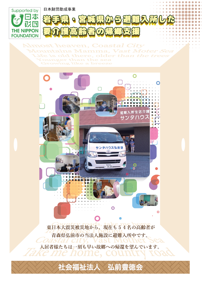 2021年度日本財団助成「岩手県・宮城県から避難入所した要介護高齢者の帰郷支援(covid19)」の事業内容を説明したパンフレット。