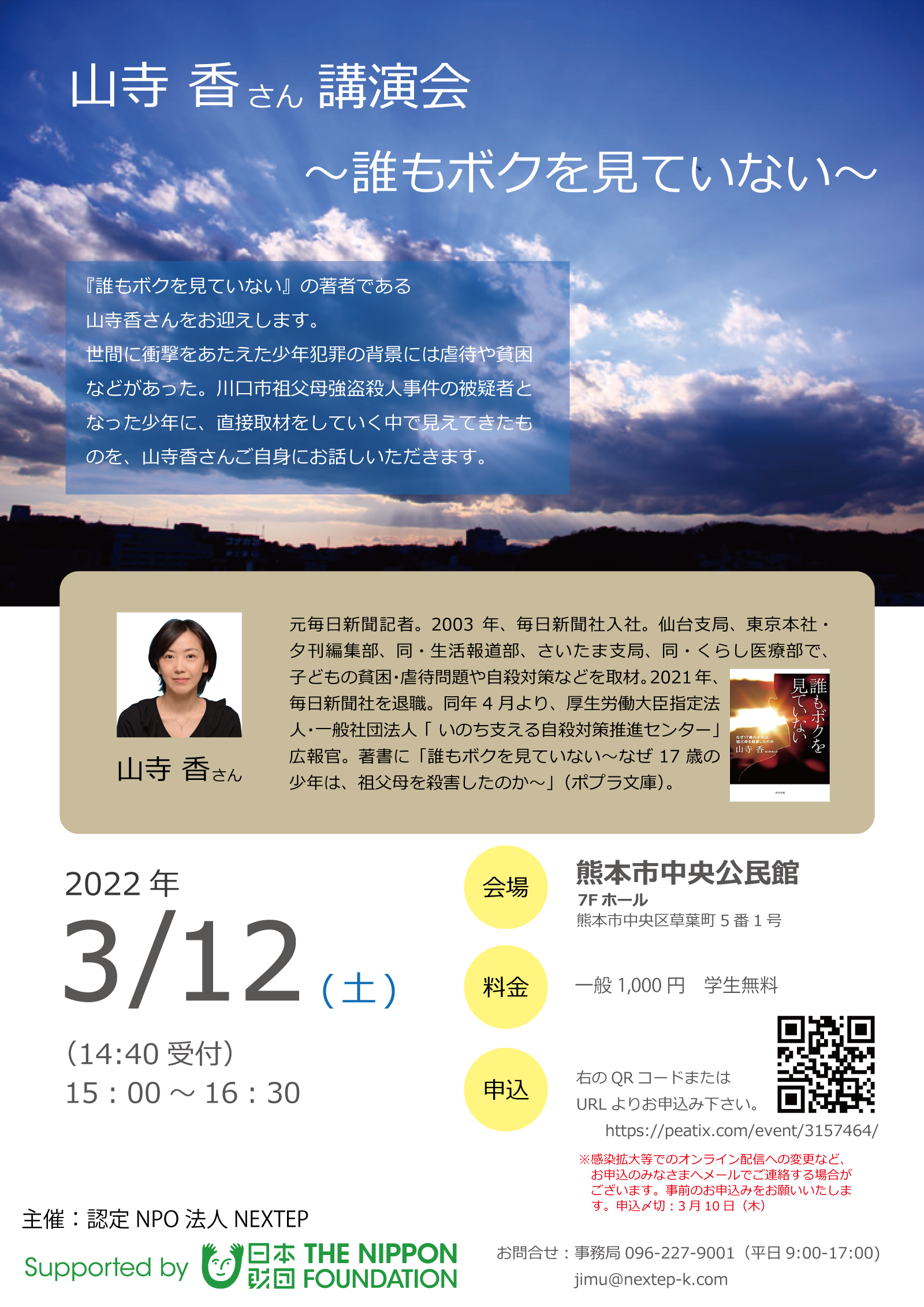 2020年度 事業名「医療的ケアに対応した地域連携ハブ拠点のモデルづくり」 NEXTEP主催 山寺香さん講演会 チラシ 2022年3月12日(土) 会場:リトルスターホール(熊本市) ※会場はチラシ作成段階では熊本市中央公民館を予定していたが、変更 |