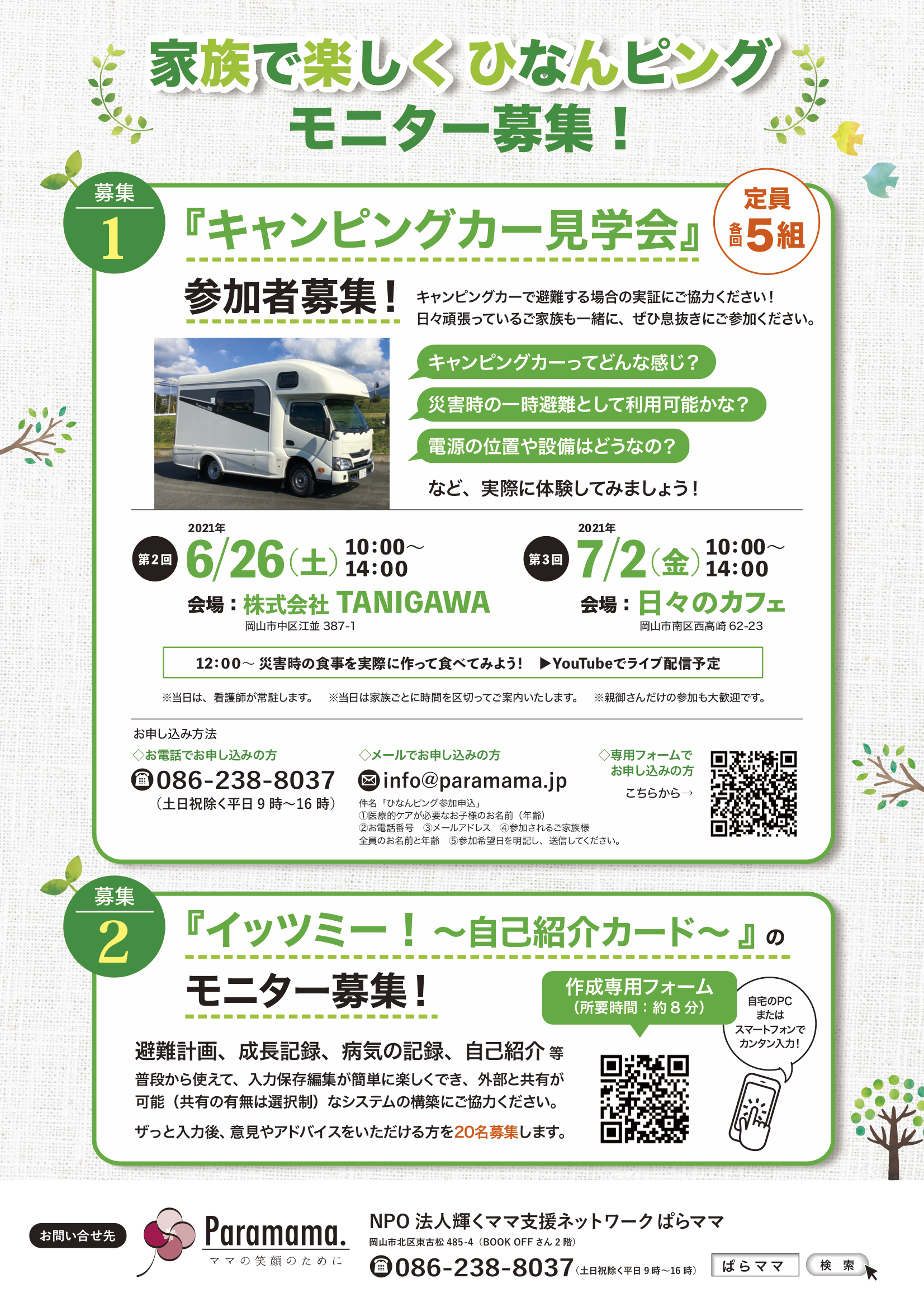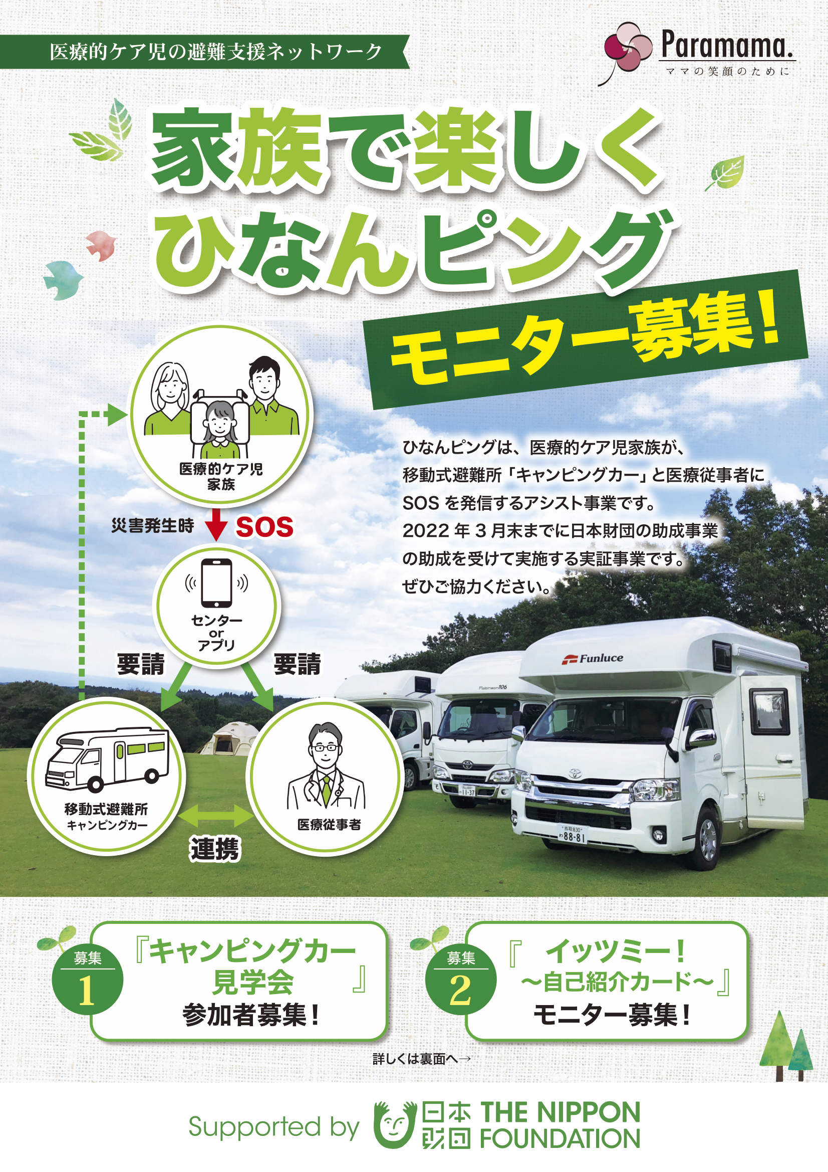 ひなんピングは、医療的ケア児家族が、移動式避難所『キャンピングカー』と医療従事者にSOSを発信するアシスト事業です。 募集1 『キャンピングカー見学会』参加者募集! 第1弾 6/26(土)10:00~14:00 第2弾 7/2(金)10:00~14:00 募集2 『イッツミー!~自己紹介カード~』モニター募集! 避難計画、成長記録、病気の記録、自己紹介等 普段から使えて、入力保存編集が簡単に楽しくでき、外部と共有が可能(共有の有無は選択制)なシステムの構築にご協力ください。 |