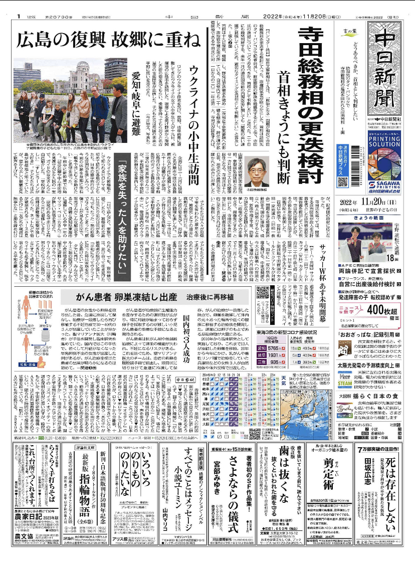 2022年11月19日〜20日に行われた、ウクライナからの避難民の子供7名が広島で戦争の実相と復興の希望を肌で感じる「U-CRANEピースキャンプ」の様子が掲載された新聞記事。
