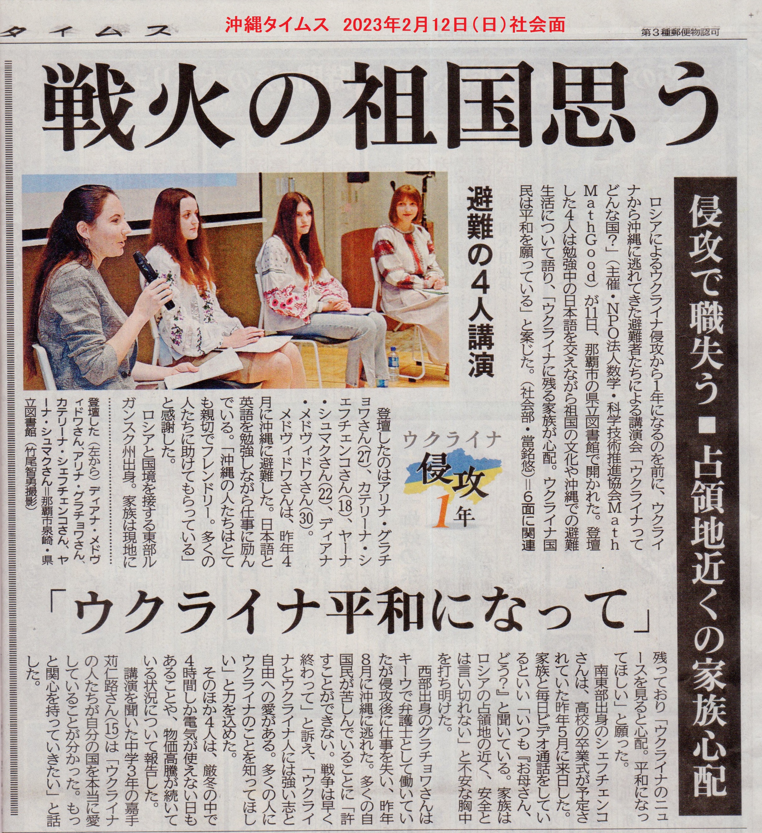 2023年2月11日16:00~18:00に沖縄県立図書館3階ホールにて ウクライナからの避難民による講演会を開催。 ウクライナの文化や地理、偉人、歴史などを紹介し、戦況や現地の状況について話した。 |
