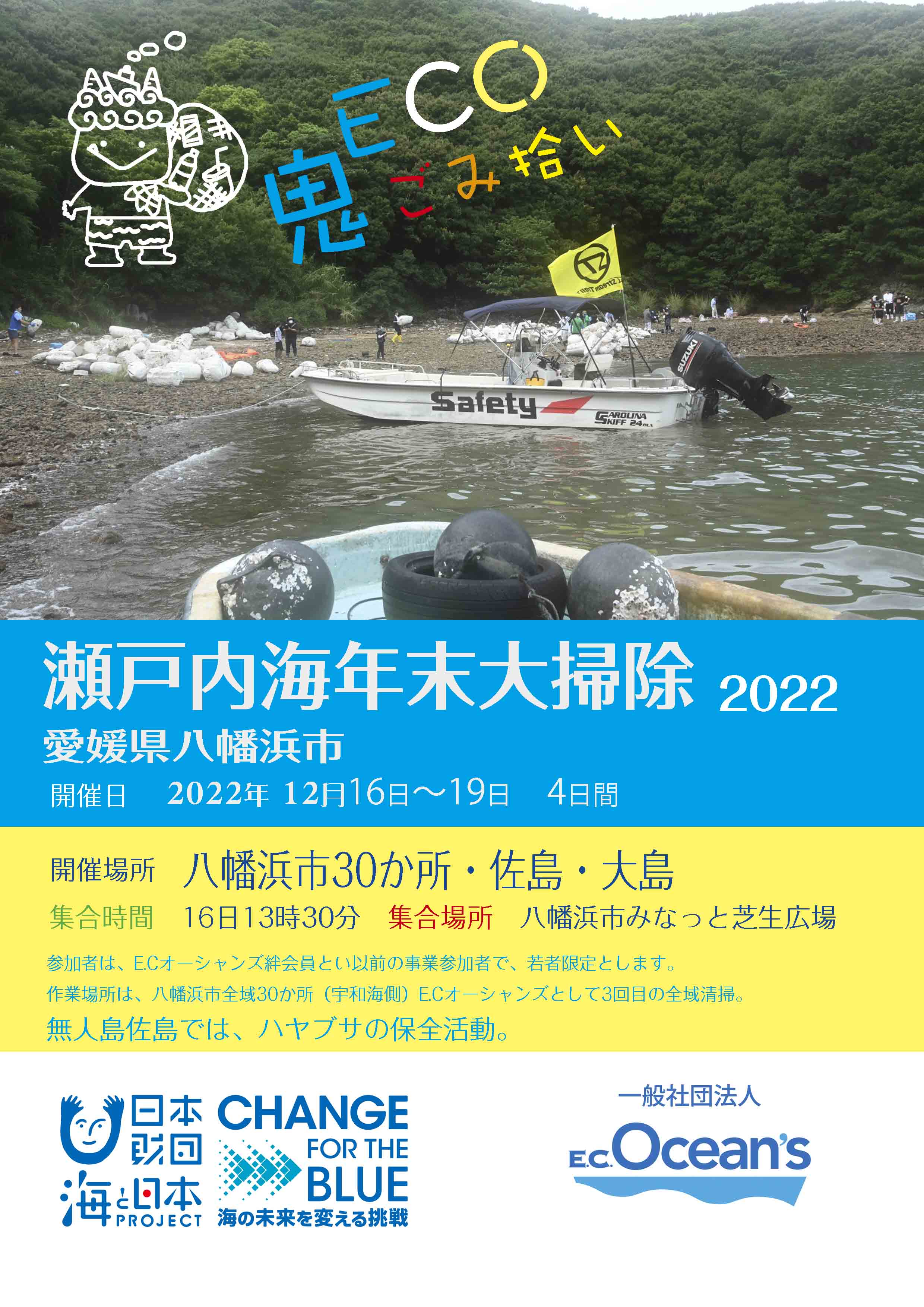 南あわじ市の市長様に、協力依頼が上手くいき、ゴミ処分場での漂着ごみの受入を承認。地域の漁協・地域住民の協力で、荷揚げ場・拠点を設置できた。対岸の徳島県鳴門市には、宿泊の応援で、帆船みらいへが帰港。作業の現場事務所としても協力できた。作業船は2艘、3日間延べ人数100人程で、大型トラック3台分・2tトラック4台分の漂着ゴミを回収できた。マスコミは、南海放送(海と日本プロジェクト担当)が兵庫県まで取材に来た。また、テレビ番組として継続取材しているクルーも参加。充実した事業内容になった。 瀬戸内海年末大掃除は、愛媛県八幡浜市で開催。冬の漂着ゴミ拾いは、夏は出来ない。毒蛇の島で開催した。マムシやハチの危険を回避した冬の鬼ごみ拾いだった。