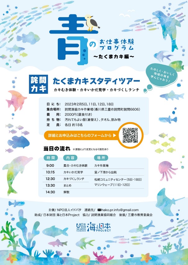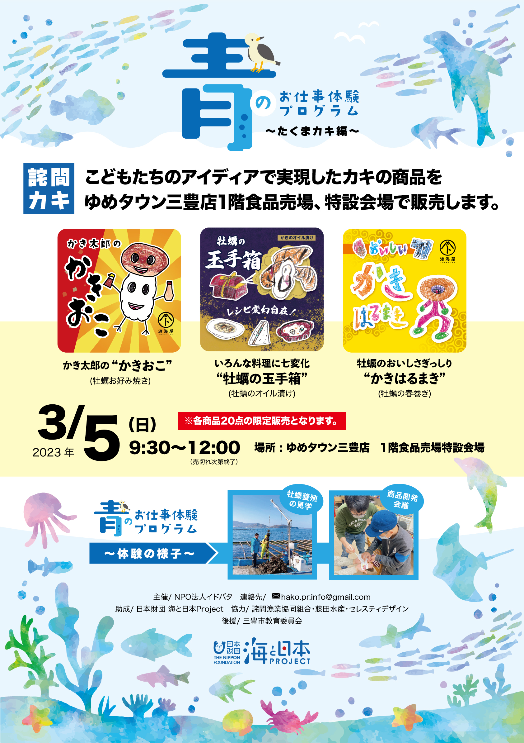 1.海のお仕事体験プログラム~たくまタイ編~チラシ 2.海のお仕事体験プログラム~カキスタディツアー~チラシ 3.海のお仕事体験プログラム~カキオリジナル商品販売体験~ポスター |