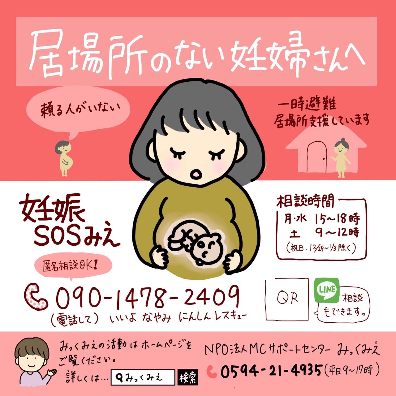 居場所のない妊婦さんへの一時宿泊場所の提供の案内等、相談や情報提供の妊娠相談窓口のSNS発信用のイラスト