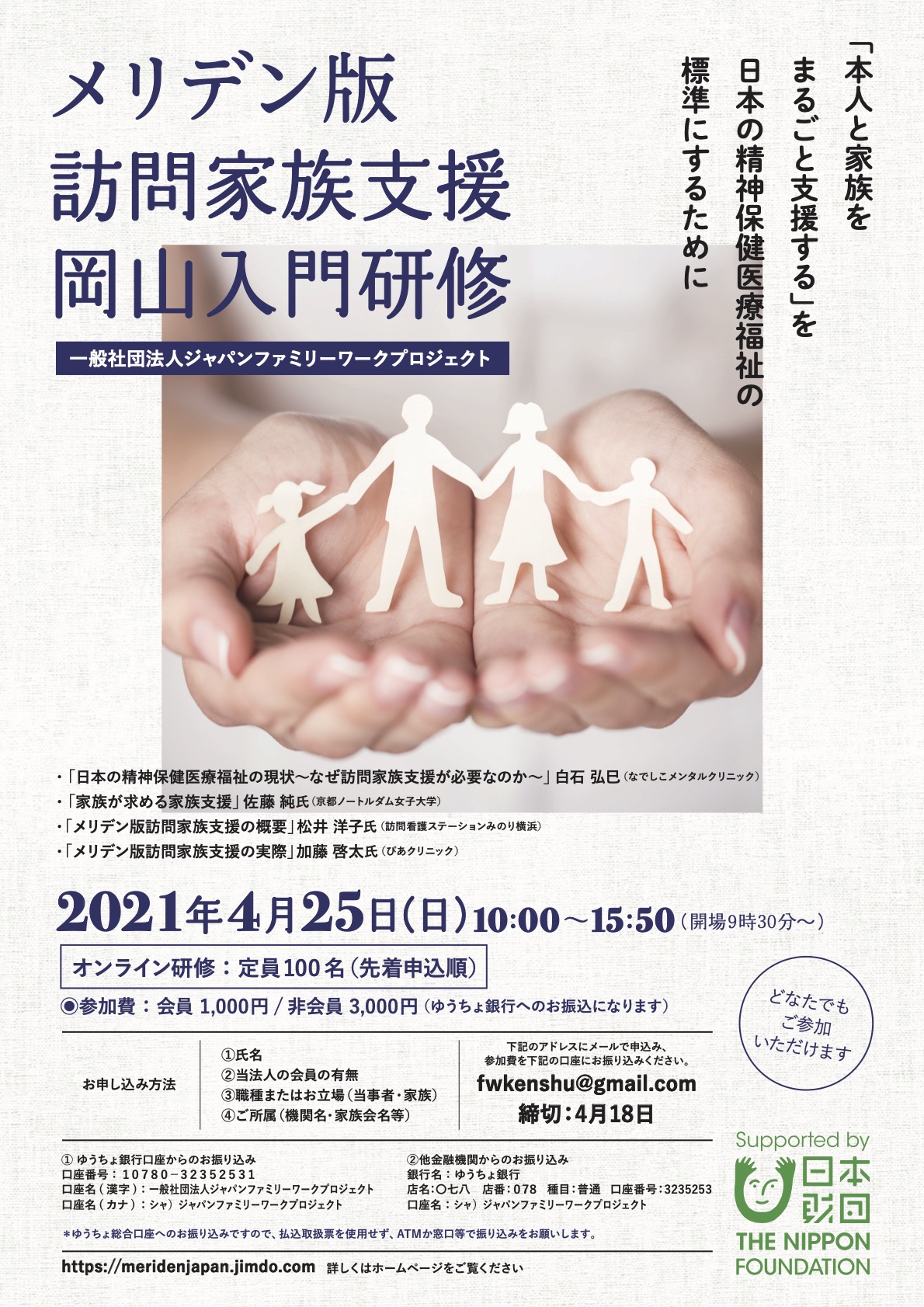 入門研修(1日)は、訪問支援の経験の少ない精神保健医療福祉従事者やメリデン版訪問家族支援に関心のある方に対して、家族支援に関する意識改革を図ることを目的とし、訪問による家族まるごと支援の重要性(家族の体験談を含む)やメリデン版訪問家族支援の概要を中心とした研修である。