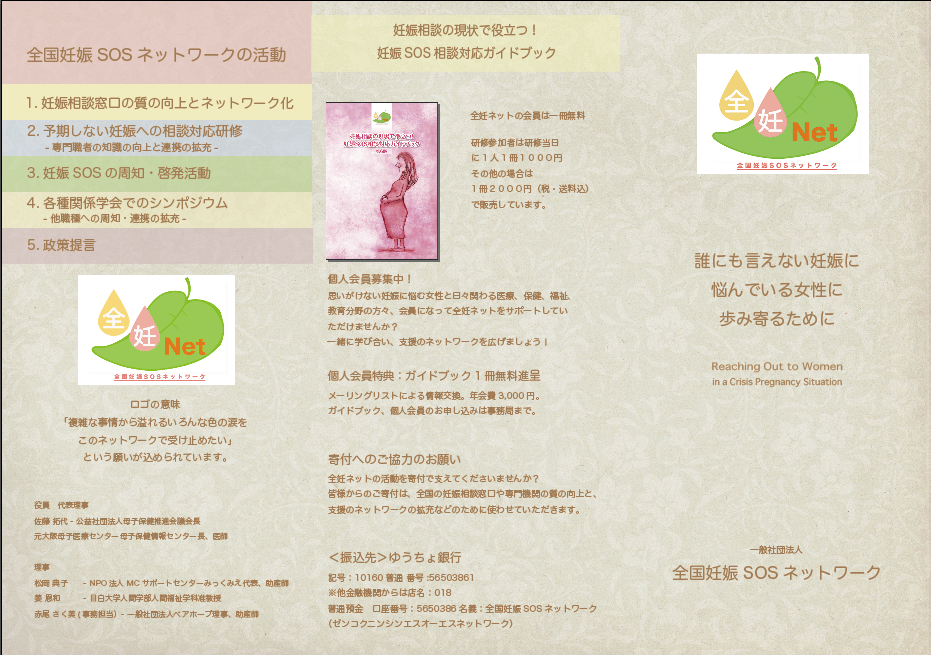 全国妊娠SOSネットワークの活動内容を盛り込んだ三つ折りパンフレット。
