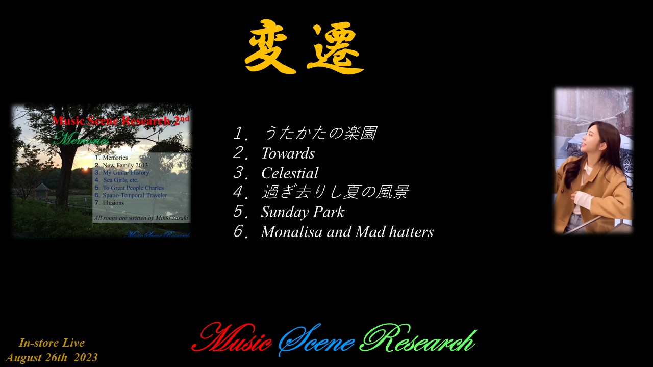 2023年5月14日 島村楽器(大高店)インストアライブ 出演 https://www.facebook.com/mikio.sasaki.940 https://www.shimamura.co.jp/shop/oodaka/article/studio/20230514/9368 2019年8月10日 島村楽器(大高店)ホットライン2019 出演 2018年8月 6日 島村楽器(大高店)ホットライン2018 出演 https://www.shimamura.co.jp/hotline/2018/artist/chubu/music-scene-research.html 過去の音楽活動の登録(Yellow&Blue by セロンクール@1979.京都教育文化センター) |