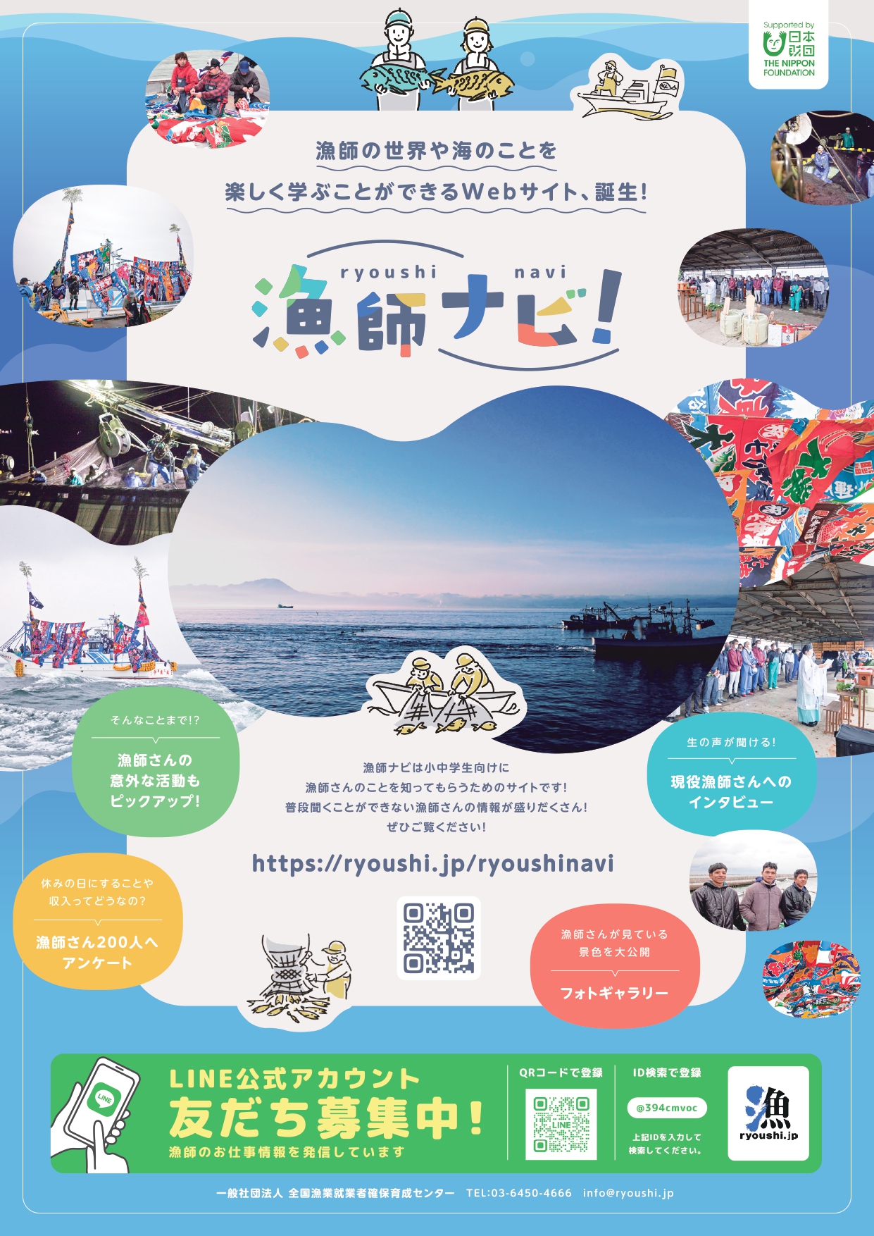 小中学生向け、「漁師の世界や海のことを楽しく学ぶことができるWebサイト」漁師ナビのPR用チラシ。