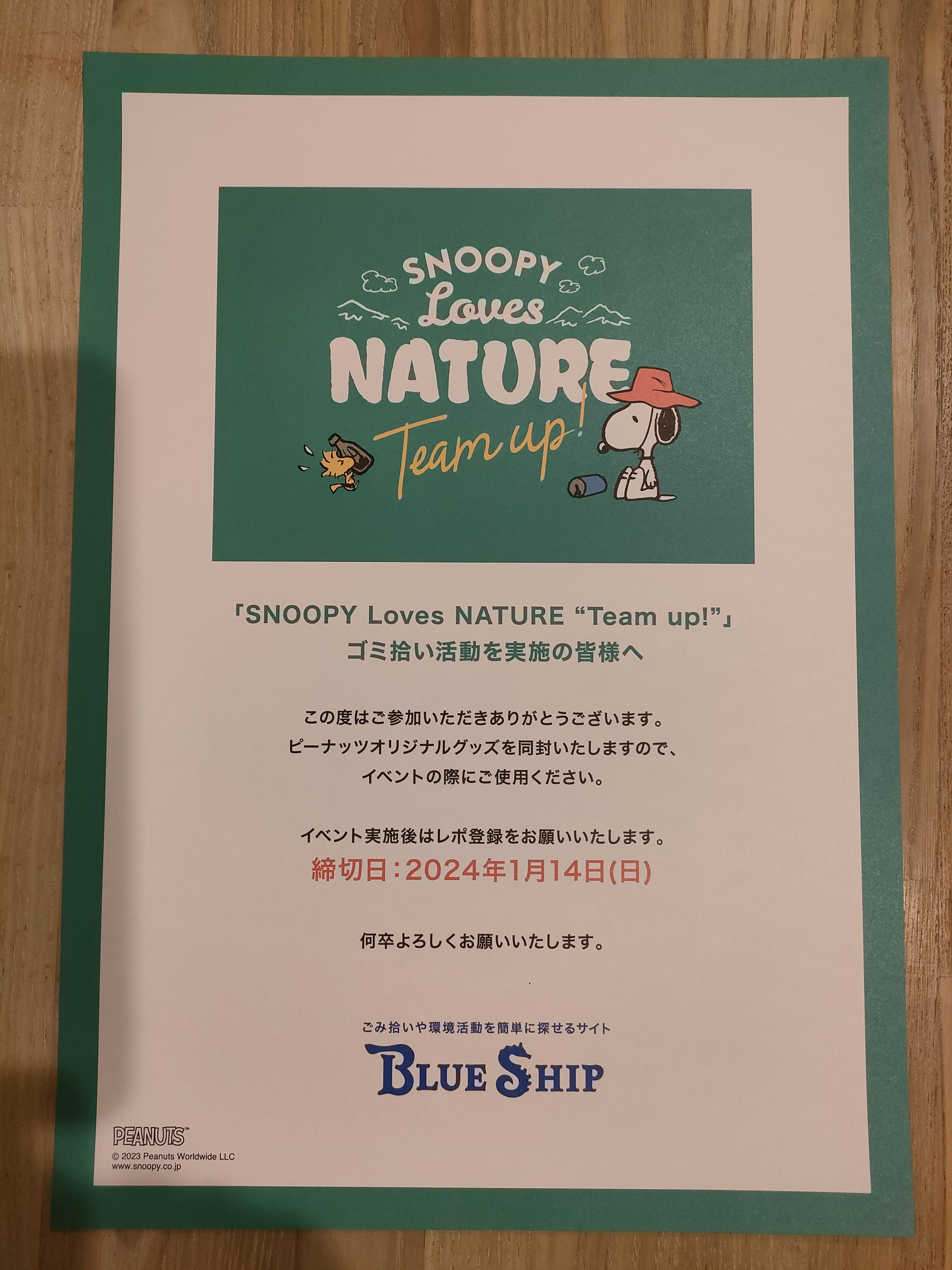 2023年度ごみ拾い・環境イベントポータルサイト「BLUE SHIP」(CFB・海と日本2023)SNOOPY Loves NATURE ”Team up!”同封紙(手袋とステッカー同封用)