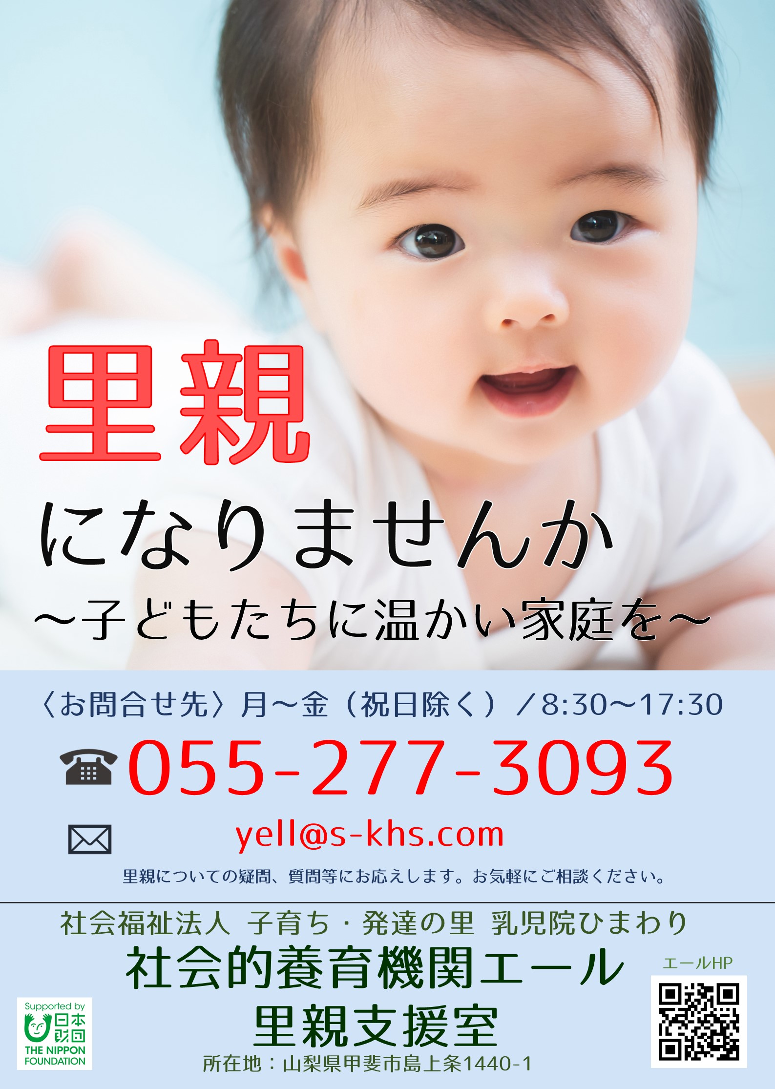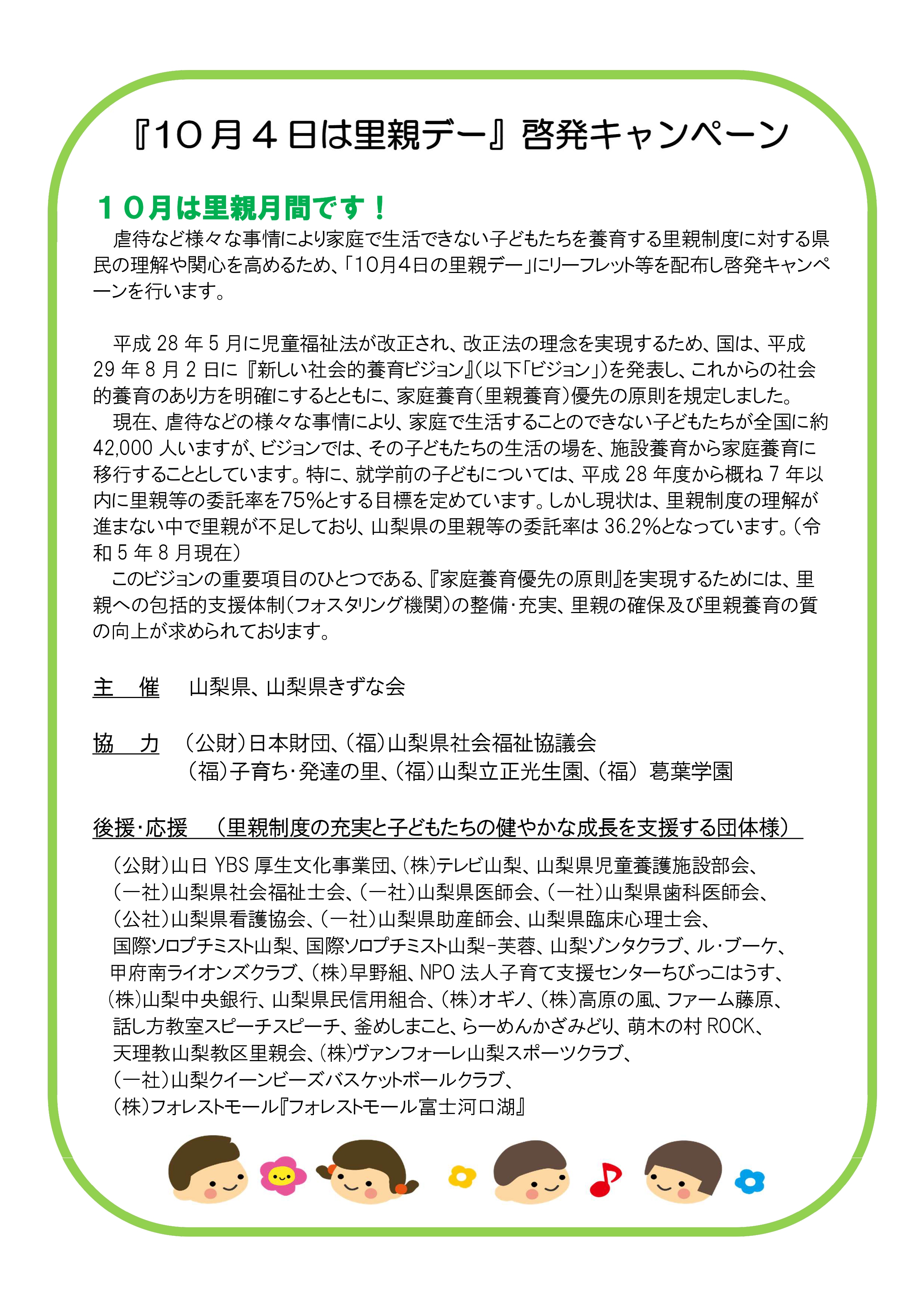 「里親になりませんか」チラシ 1300枚 「里親になりませんか」ポスター 6枚 「里親ディ応援団体」チラシ 900枚 プロモーションビデオ(30秒) 1点 |