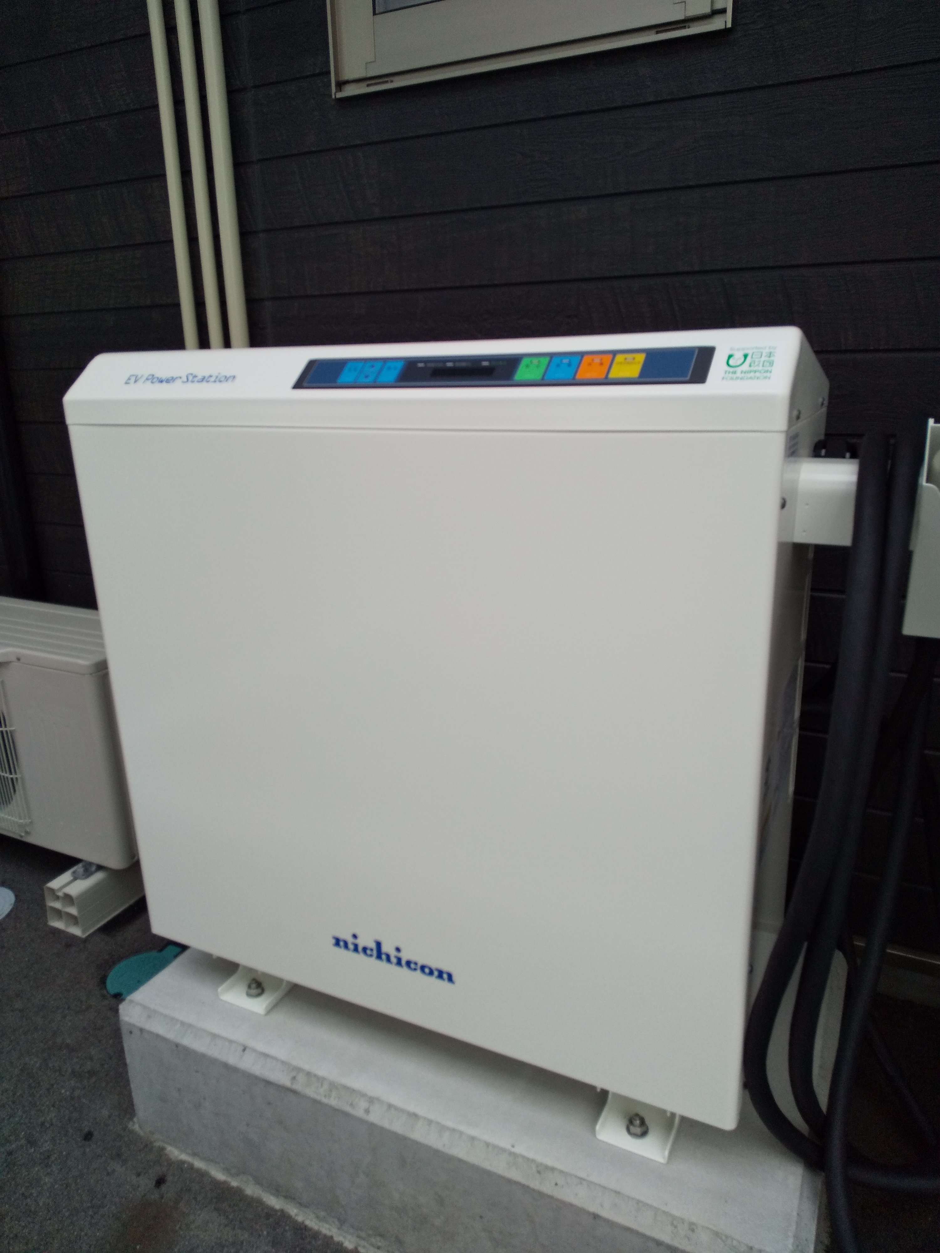 その内容は下記の通りです。 ・日産リーフ(5ドアハッチバック EM57 X 2WD) 1台 ・V2H充放電設備(ニチコンEVパワーステーション) 設置工事一式 |