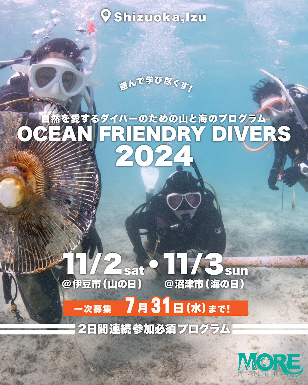 <内容> Ocean Friendly Divers運営事務局による、海と山の体験学習プログラムを開催。伊豆市と沼津市を会場として、2日間の体験学習とダイビングを実施しプログラム全体を通して環境問題について学習した。参加したダイビングショップは5店で、いずれも1名~4名のゲストを連れて参加した。 1日目:山のゴミ拾い、ランチ、体験学習、潜水士トーク 2日目:水中清掃、ゴミの分別、記念撮影 ターゲット 環境問題に興味関心があるスクーバダイバー(ライセンス保持者限定) <概要> 期間:2024年 11月 2日 (土) 11月 3日 (日) 2日間 場所:静岡県伊豆市(原保公民館)、静岡県沼津市(平沢マリンセンター、内浦漁港) 周知方法:Instagram、facebookの有料広告、ダイビングサービスでのポスター掲載、ゲスト集客は、各ダイビングショップで実施 申し込み期間:一次募集:2024/06/01~2024/07/31、二次募集:2024/09/01~2024/09/30 <申し込みからの流れ> ①ダイビングショップからの資料請求 ②説明の上、お申し込み(ダイビングショップ単位、人数は無料で変更可) ③8月、9月、10月にダイビングショップと連携(参加人数、体験希望、質問受付) ④事前説明会の実施(予定していたが日程調整に苦戦、希望されず、実施せず) <参加団体> MORE企画:運営事務局(主催) 坪根雄大:フォト&ビデオグラファー サンライズダイビング(5名) Diving shop K’z MARINE(2名) ダイビングプロショップSEA HEAT(シーヒート)(4名) EDIVER’S (いーだいばーず)(4名) <参加人数> ゲスト:11名、インストラクター:7名、ボランティアスタッフ:9名、カメラマン:1名 出張ヨガ講師:1名、ランチ提供者:1名、わさび狩り体験提供者:2名、卓話者:1名 ダイビングセンタースタッフ:1名、2日目出店者:11名 |