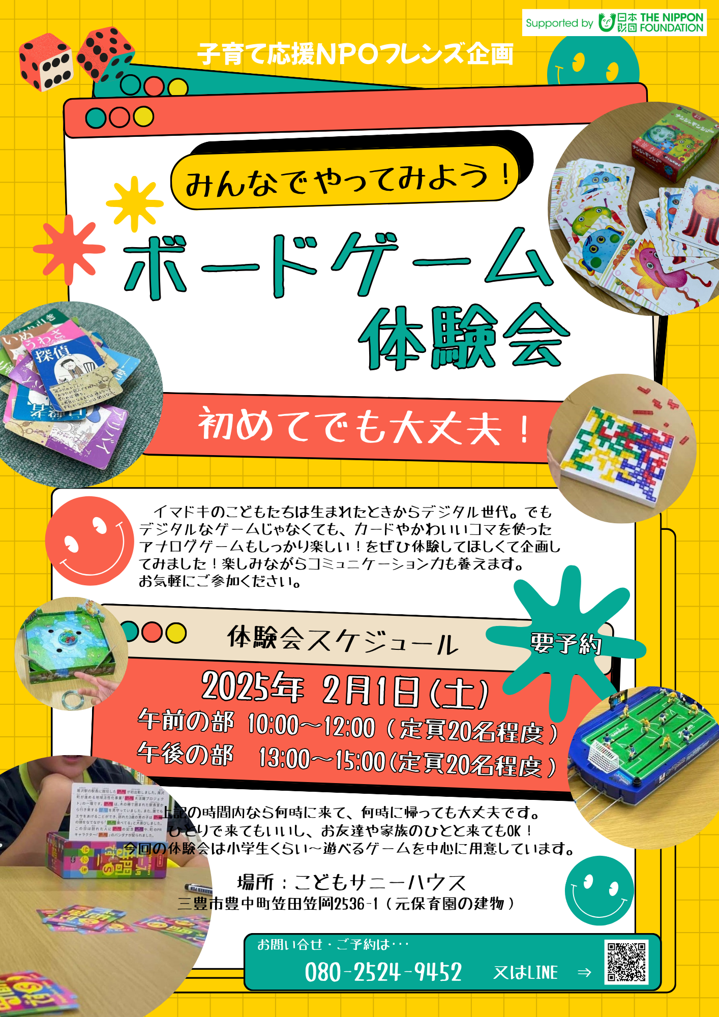 ボードゲームを通したコミュケーションの楽しさを知ってもらい居場所として楽しく利用できる場所であることを知ってもらう企画のチラシ