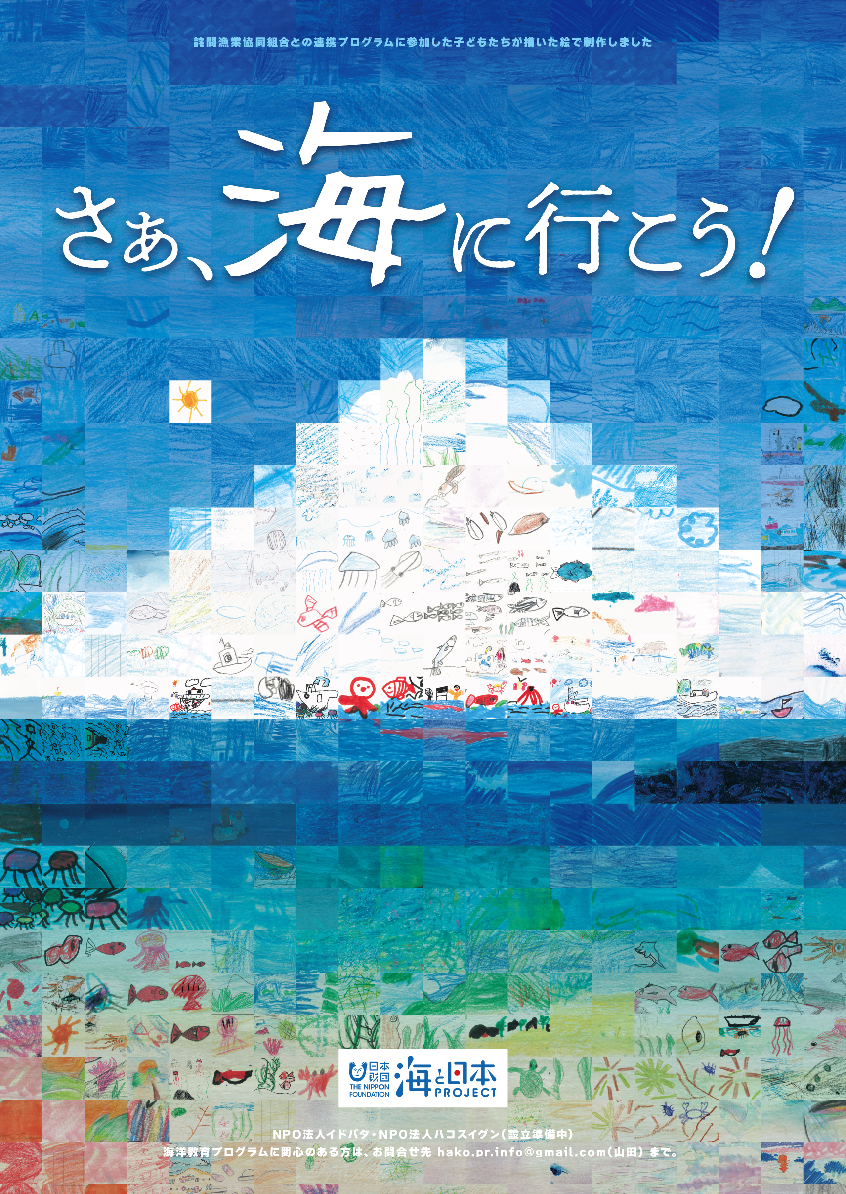 海から陸を見る漁船体験を実施。参加者に描いてもらった海の絵を使ったポスターを制作。